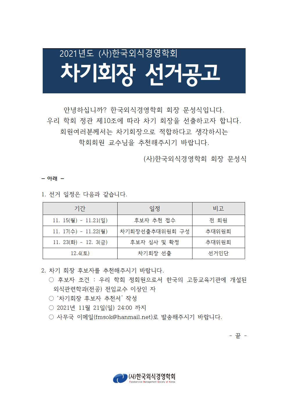 ○ 후보자 조건 : 우리 학회 정회원으로서 한국의 고등교육기관에 개설된 외식관련학과(전공) 전임교수 이상인 자