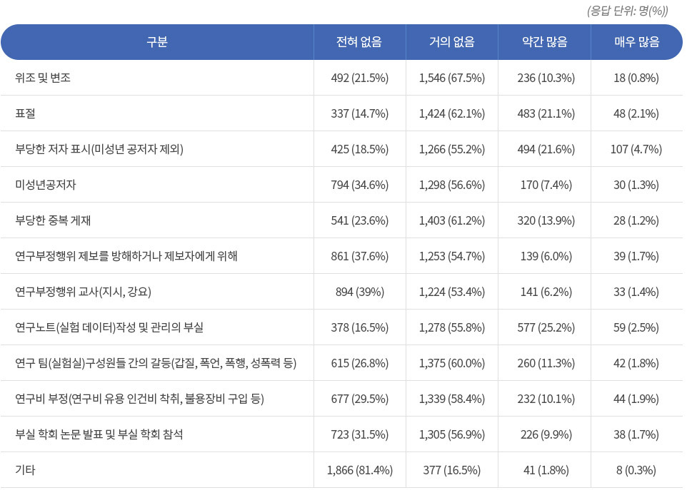 대학 교원이 인식하는 연구부정 및 연구부적절 행위 발생 빈도