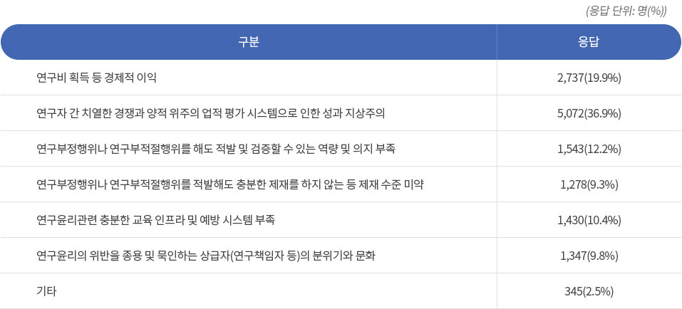 대학 교원들은 연구부정행위가 지속적으로 발생하는 이유에 대해 ‘연구자 간 치열한 경쟁과 양적 위주의 업적 평가 시스템으로 인한 성과 지상주의’ (36.9%)라고 지적했습니다. 그 외에도 ‘연구비 획득 등 경제적 이익’(19.9%)과 ‘연구부정행위나 연구부적절 행위를 해도 적발 및 검증할 수 있는 역량 및 의지 부족’(12.2%)도 지속적인 연구부정행위 발생원인으로 꼽았습니다.