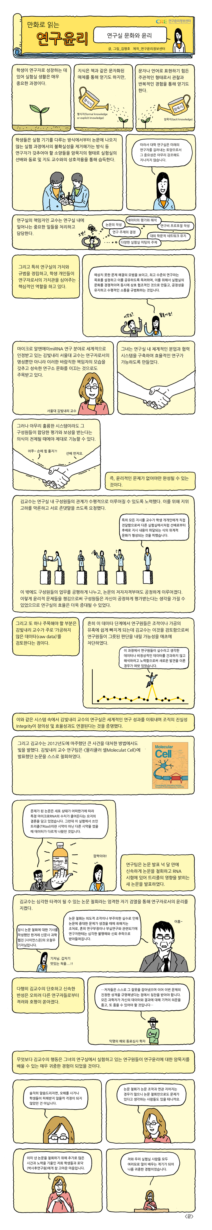 김빛내리 교수의 연구실 문화와 논문 철회에 대해 소재가 매우 좁아 연구자가 아니면 자세히 알 수 없으며, 참고할 수 있는 문서도 극히 부족했습니다. 그래서 김빛내리 교수의 연구실에 관한 내용은 [홍성욱, 장하원 '실험실과 창의성' 과학기술학연구 10.1 (2010):27-71]에서, 논문 철회에 관한 내용은 한겨례 신문사 과학 웹진 사이언스온 ['김빛내리 교수의 논문에 무슨 일이...', 오철우, 사이언스온, 2012년 7월 21일]에서 많은 부분 인용, 발췌하였습니다. 만화 매체 특성상 인용, 발췌 표시를 전부 넣을 수 없어 각각 홍성우 교수님과 오철우 기자님의 허락을 구하고 본문에서의 표시는 생략하였습니다.