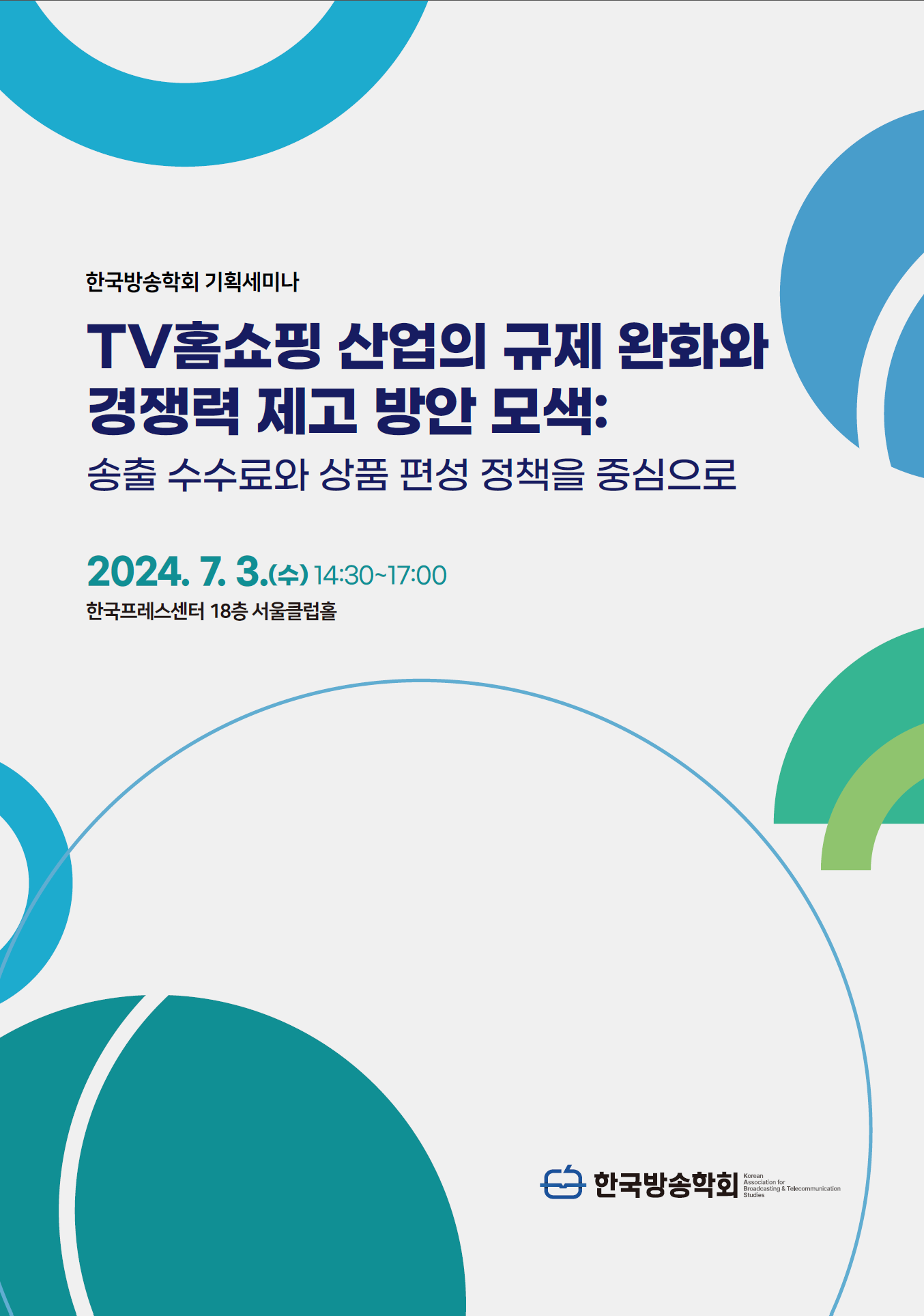 한국방송학회(학회장 전범수, 한양대 교수)는 오는 3일(수) 14시 30분부터 한국프레스센터 18층 서울클럽홀에서 <TV홈쇼핑 산업의 규제 완화와 경쟁력 제고 방안 모색: 송출 수수료와 상품 편성 정책을 중심으로>라는 주제로 기획세미나를 개최한다.