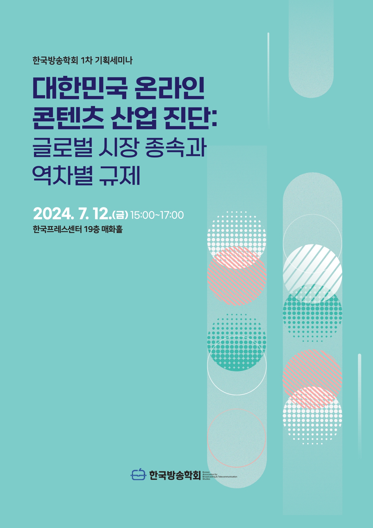 한국방송학회(학회장 전범수, 한양대 교수)는 오는 12일(금) 15시부터 한국프레스센터 19층 매화홀에서 ‘대한민국 온라인 콘텐츠 산업 진단: 글로벌 시장 종속과 역차별 규제’를 주제로 기획세미나를 개최한다. 이번 세미나는 국내 온라인 콘텐츠 산업의 현황을 진단하고, 국내 산업 활성화와 콘텐츠 소비자 보호의 관점에서 글로벌 콘텐츠 플랫폼의 확산을 평가하기 위해 마련되었다.