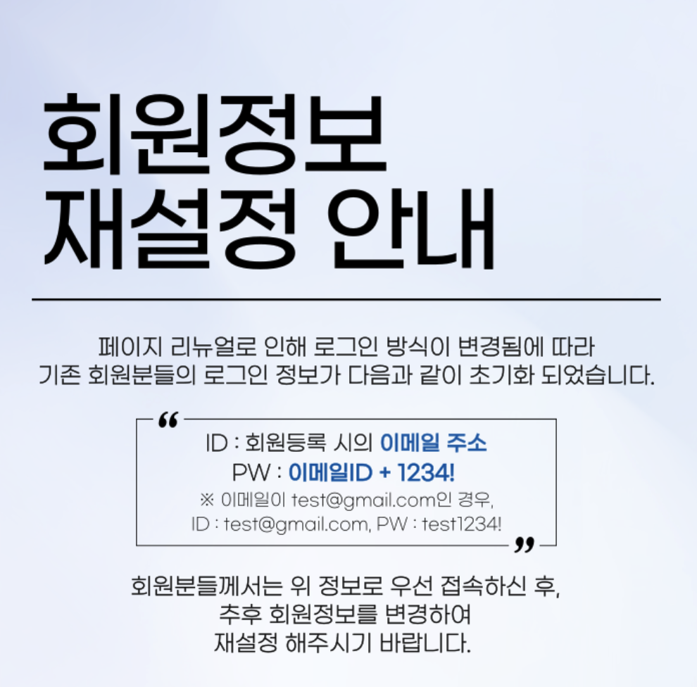 Upon your first sign-in, your ID will be the email address you used when registering, and your initial temporary password will be your email ID followed by “1234!”. For example, if your registered email is “test@gmail.com,” your temporary password will be “test1234!”.