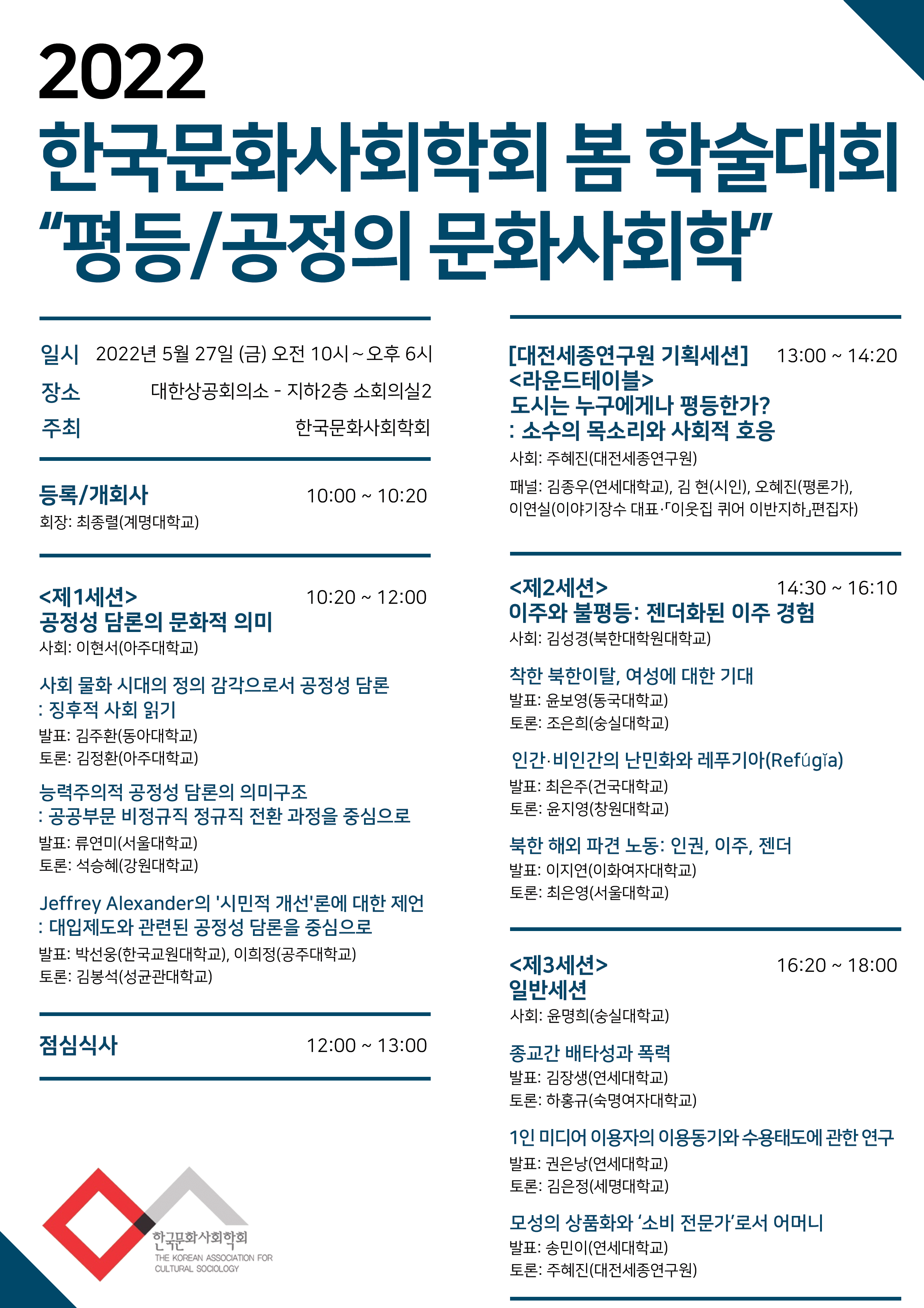 2022년 한국문화사회학회 봄학술대회에서는 다양한 영역에서 표출되고 있는 '평등/공정'과 관련된 사회문화적 현상들을 문화사회학적 시각에서 진단하고 탐색해보고자 합니다. 이번 봄학술대회에 참여하여 이와 관련한 회원님들의 다양한 시각과 의견을 나누어 주시기를 부탁드립니다.