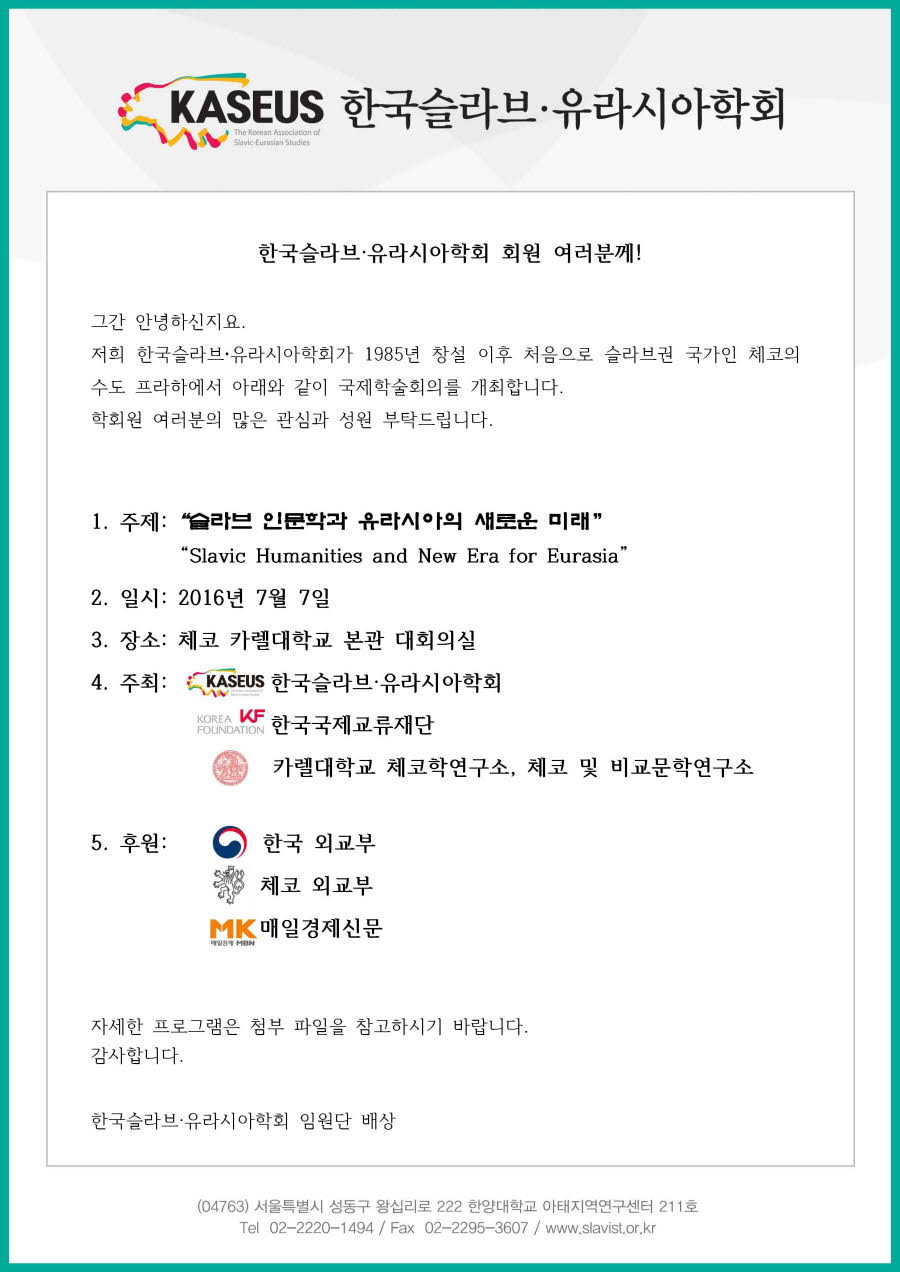 1985년 학회 창설 이후 최초로 체코 프라하에서 개최되는 이번 국제학술회의에 학회원 여러분의 많은 관심과 성원 부탁드립니다.