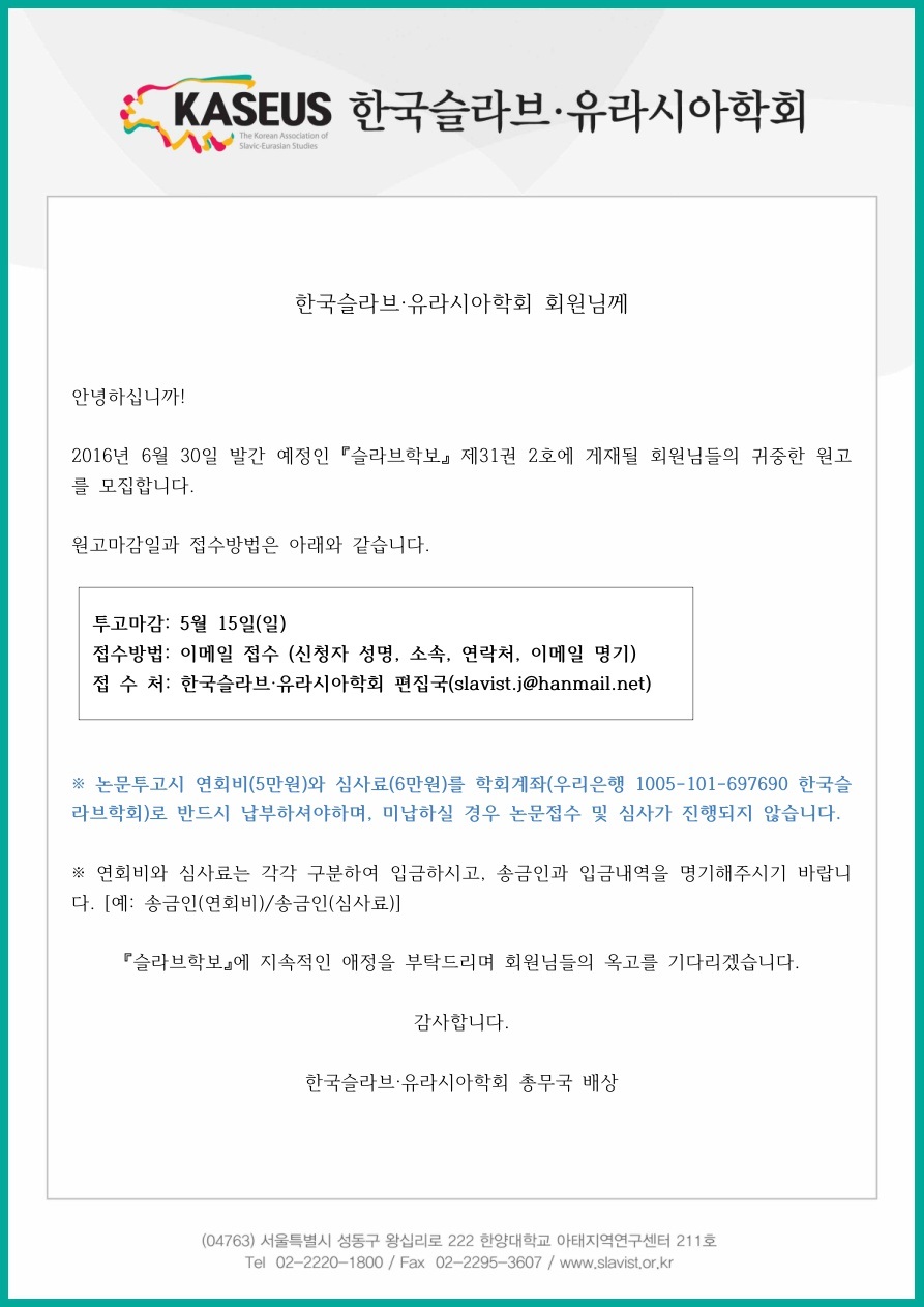 슬라브학보 제31권 2호 논문투고 안내