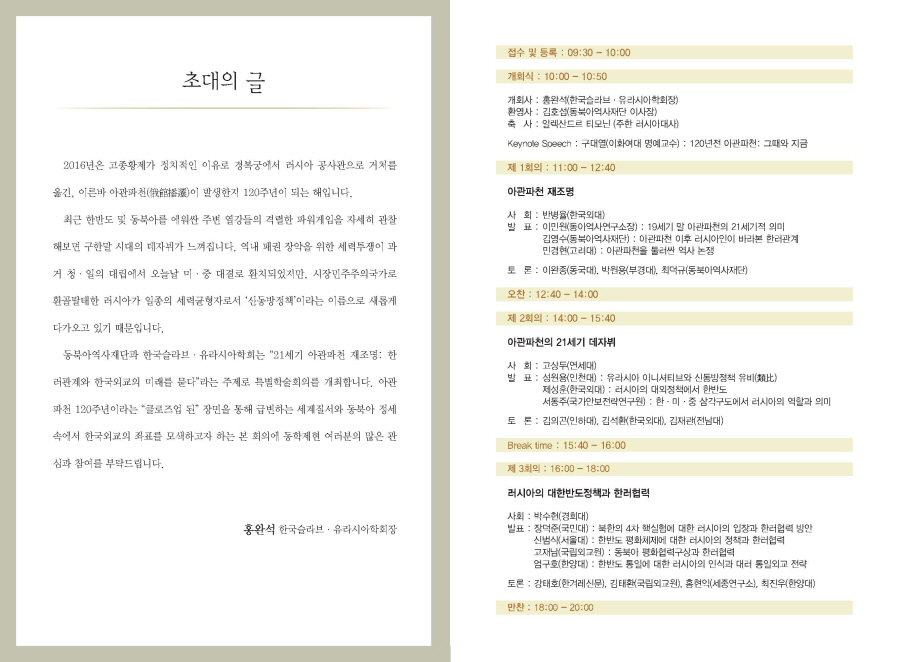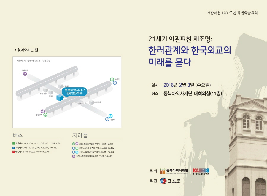 동북아역사재단과 한국슬라브·유라시아학회는 '21세기 아관파천 재조명: 한러관계와 한국외교의 미래를 묻다:라는 주제로 특별학술회의를 개최합니다. 아관파천 120주년이라는 '클로즈업 된' 장면을 통해 급변하는 세계질서와 동북아 정세 속에서 한국외교의 좌표를 모색해보고자 본 특별학술회의를 기획하였습니다.