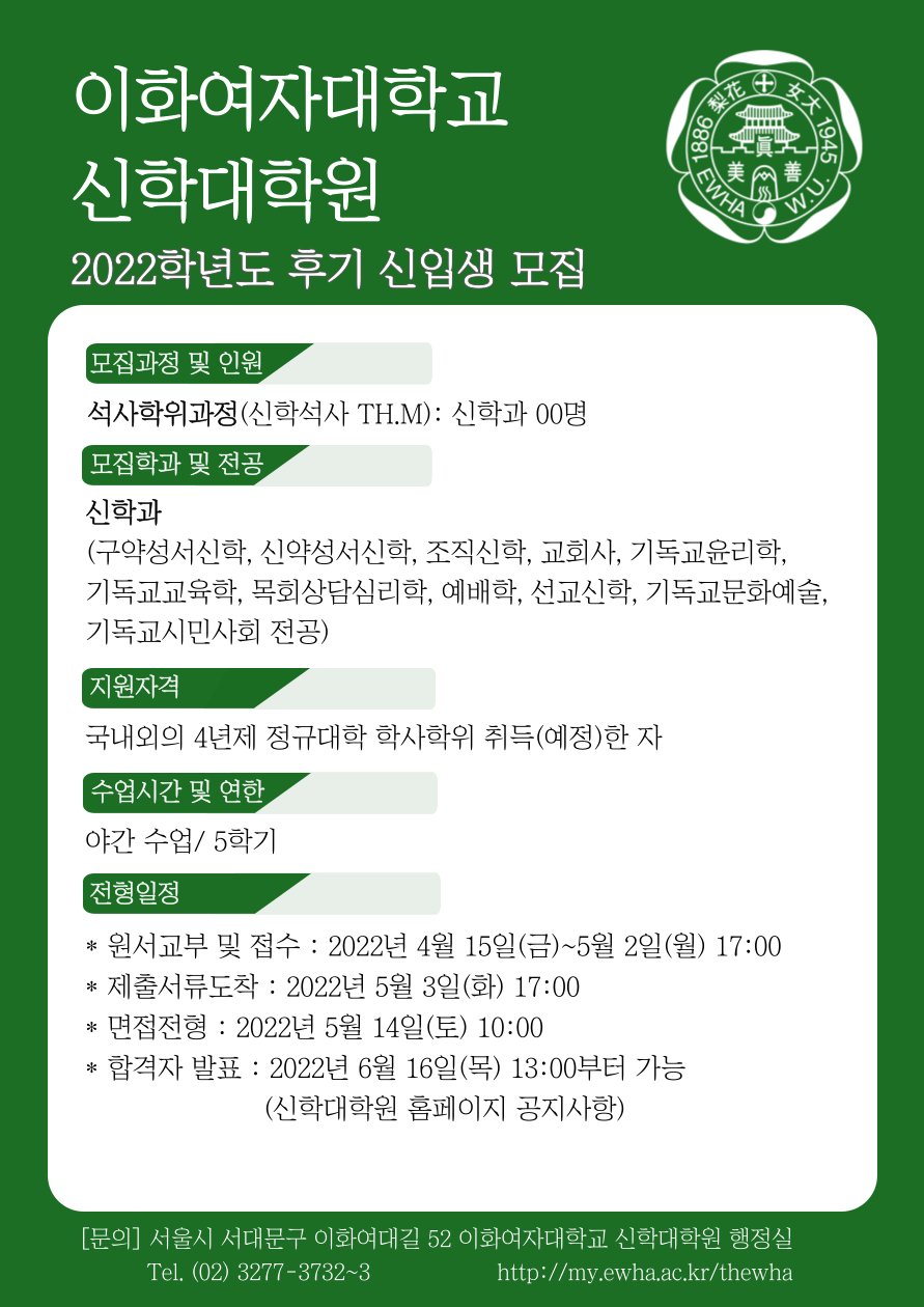 (우편 접수) (03760) 서울특별시 서대문구 이화여대길 52, 대학교회 103호 (신학대학원 행정실)