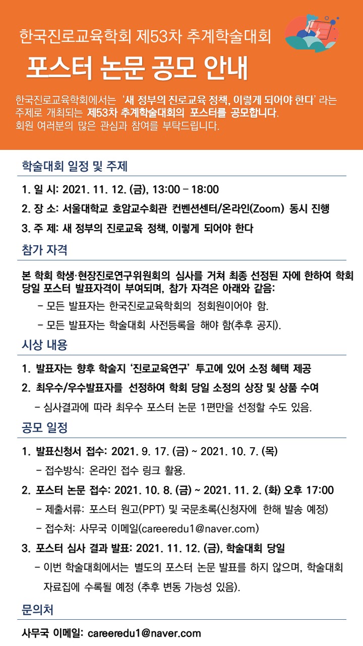 '새 정부의 진로교육 정책, 이렇게 되어야 한다'라는 주제로 제53차 추계학술대회를 개최할 예정입니다.