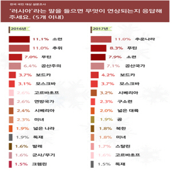 5일 한국외대 러시아연구소(소장 강덕수)는 한국리서치, 러시아여론조사센터 프치옴이 공동으로 한국인 1000명과 러시아인 1200명을 상대로 진행한 상호인식조사 결과를 발표했다. 지난해에 이어 두번째 조사다. 연구소는 오는 6~7일 문재인 대통령의 러시아 극동 블라디보스토크 ‘동방경제포럼’ 참석과 블라디미르 푸틴 대통령과의 한·러 정상회담을 앞두고 이같은 결과를 발표했다.