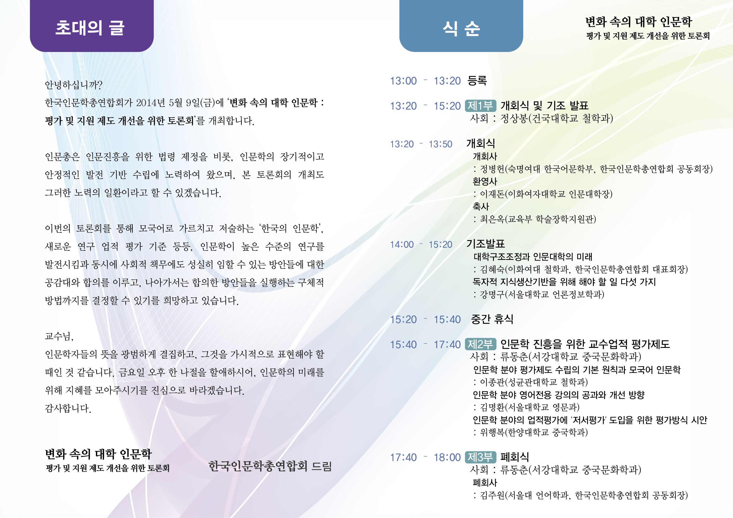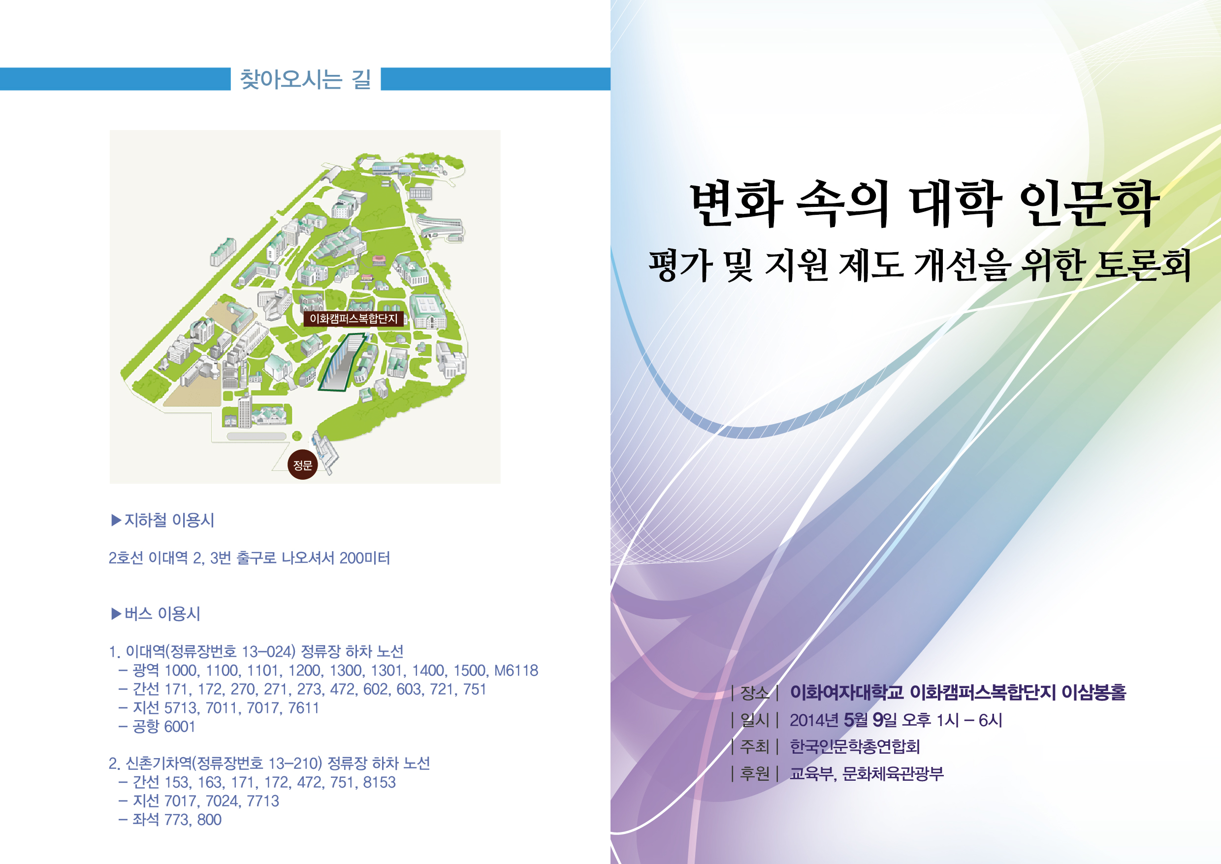 한국인문학총연합회가 주최하는 <변화 속의 대학 인문학 : 평가 및 지원제도 개선을 위한 토론회>가 이번 주 금요일에 열립니다.