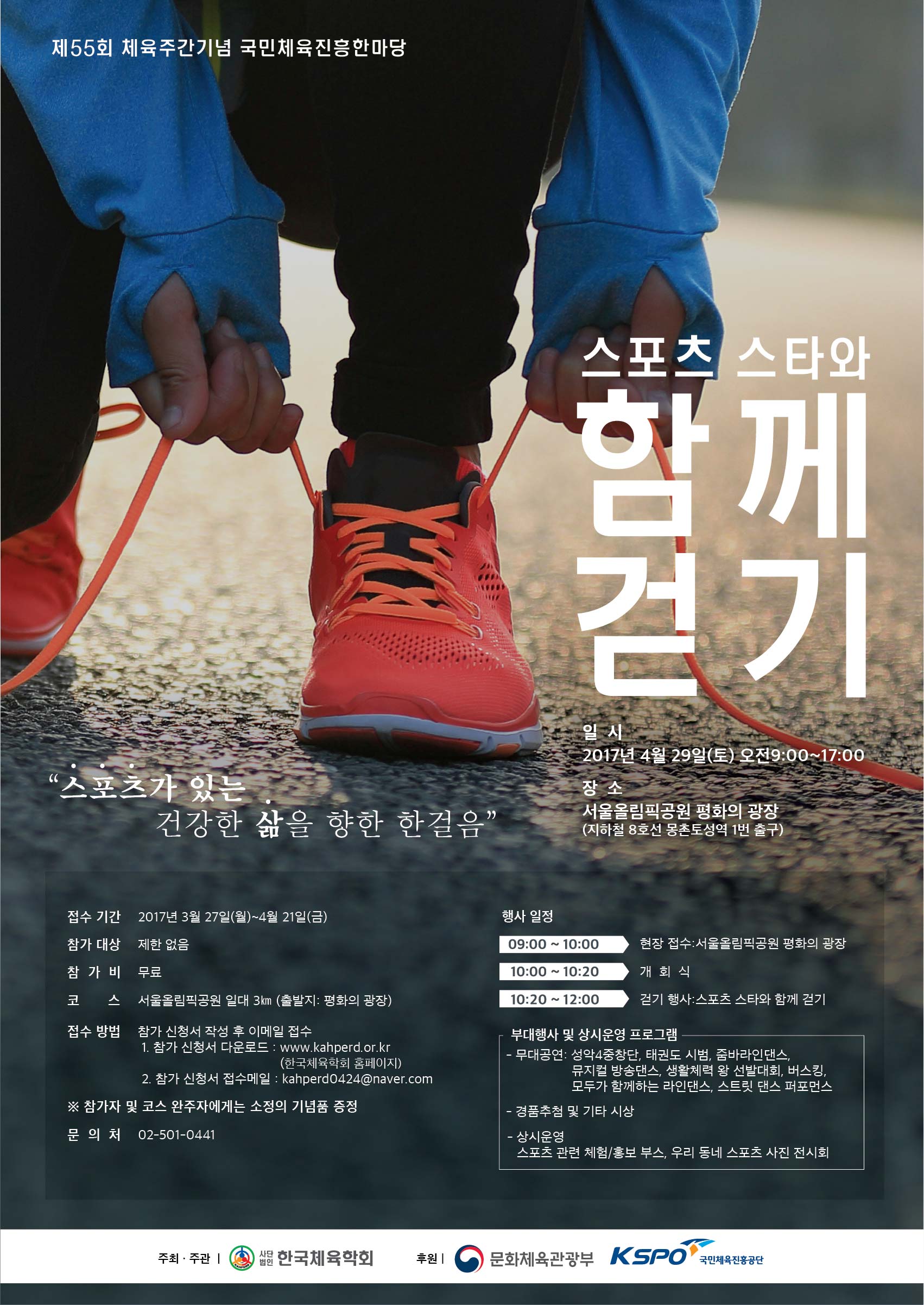 한국체육학회에서 4월 체육주간을 맞이하여 '제55회 체육주간 기념 국민체육진흥한마당'? 중 스포츠 스타와 함께 걷기 프로그램을 전달 안내합니다.