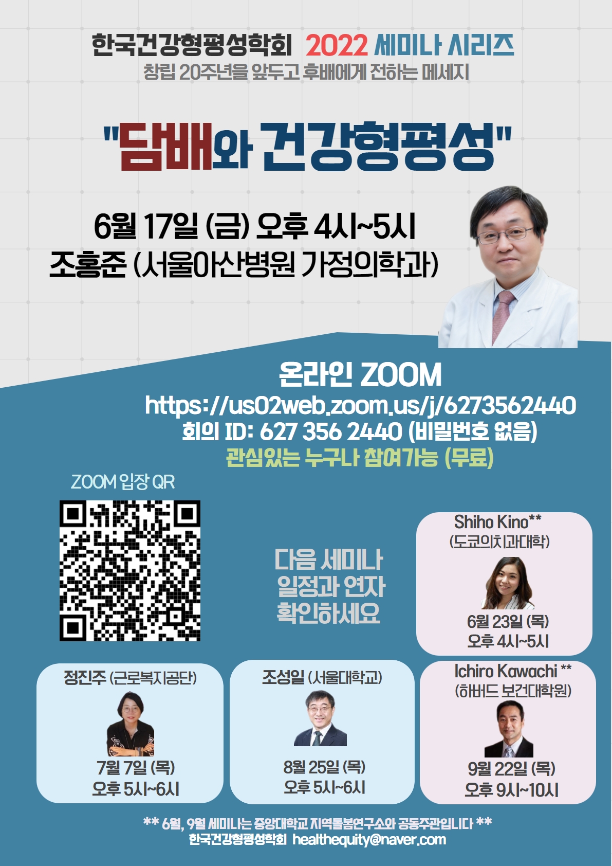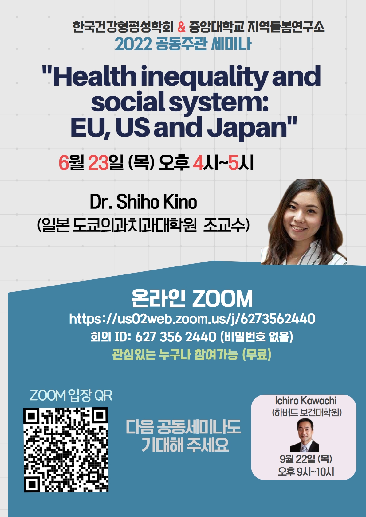 6월 23일에는 'Health inequality and social system: EU, US and Japan'를 주제로 세미나를 진행합니다.