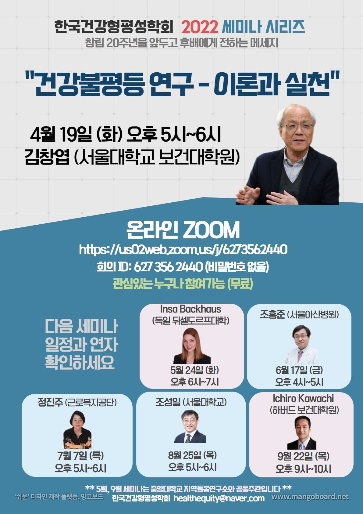 4월 세미나 제목은 '건강불평등 연구-이론과 실천' 입니다.