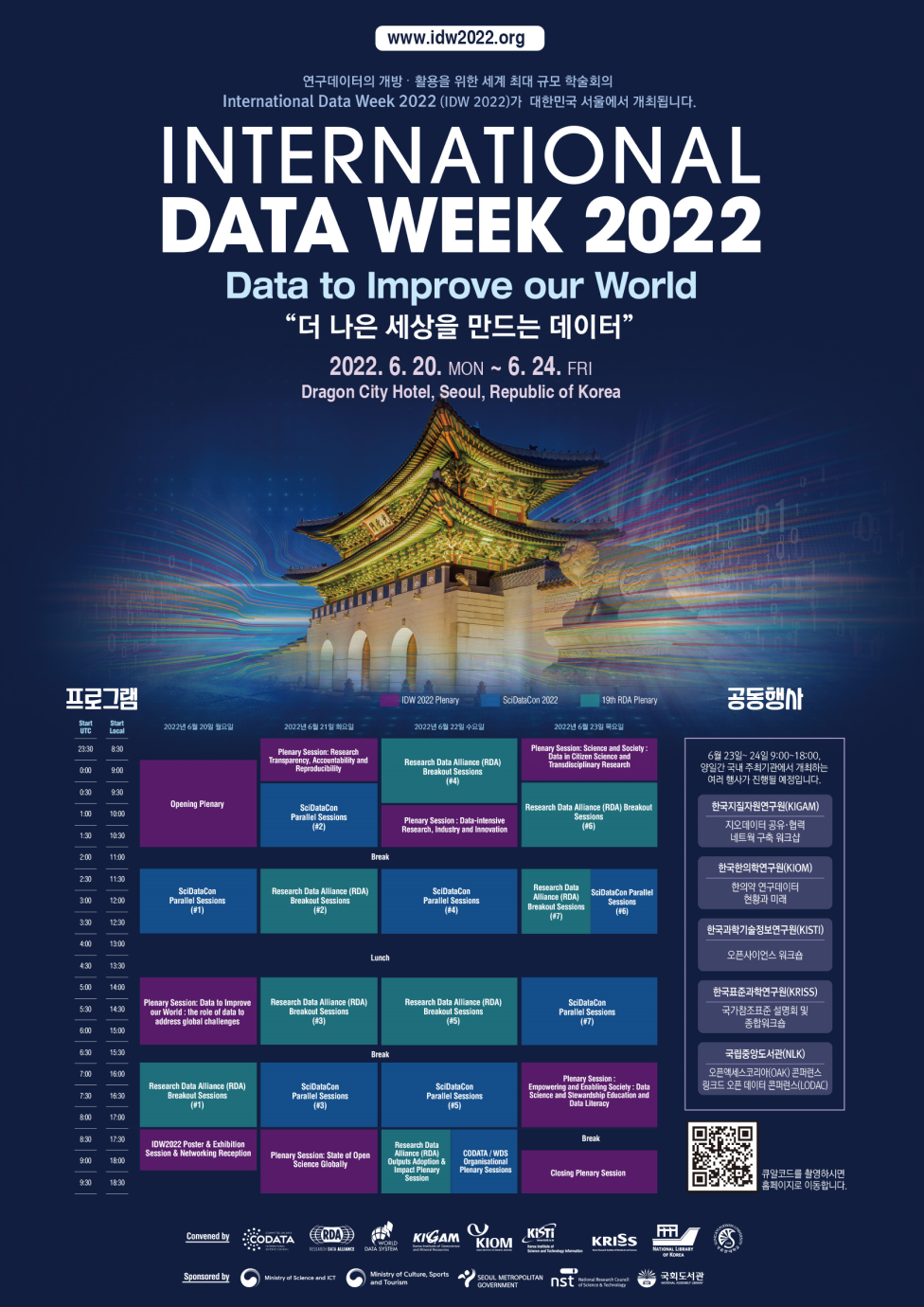 연구데이터 관련 최대 국제행사인 International Data Week 2022(IDW 2022)가 6월 20일부터 24일까지 서울드래곤시티(용산)에서 개최됩니다.