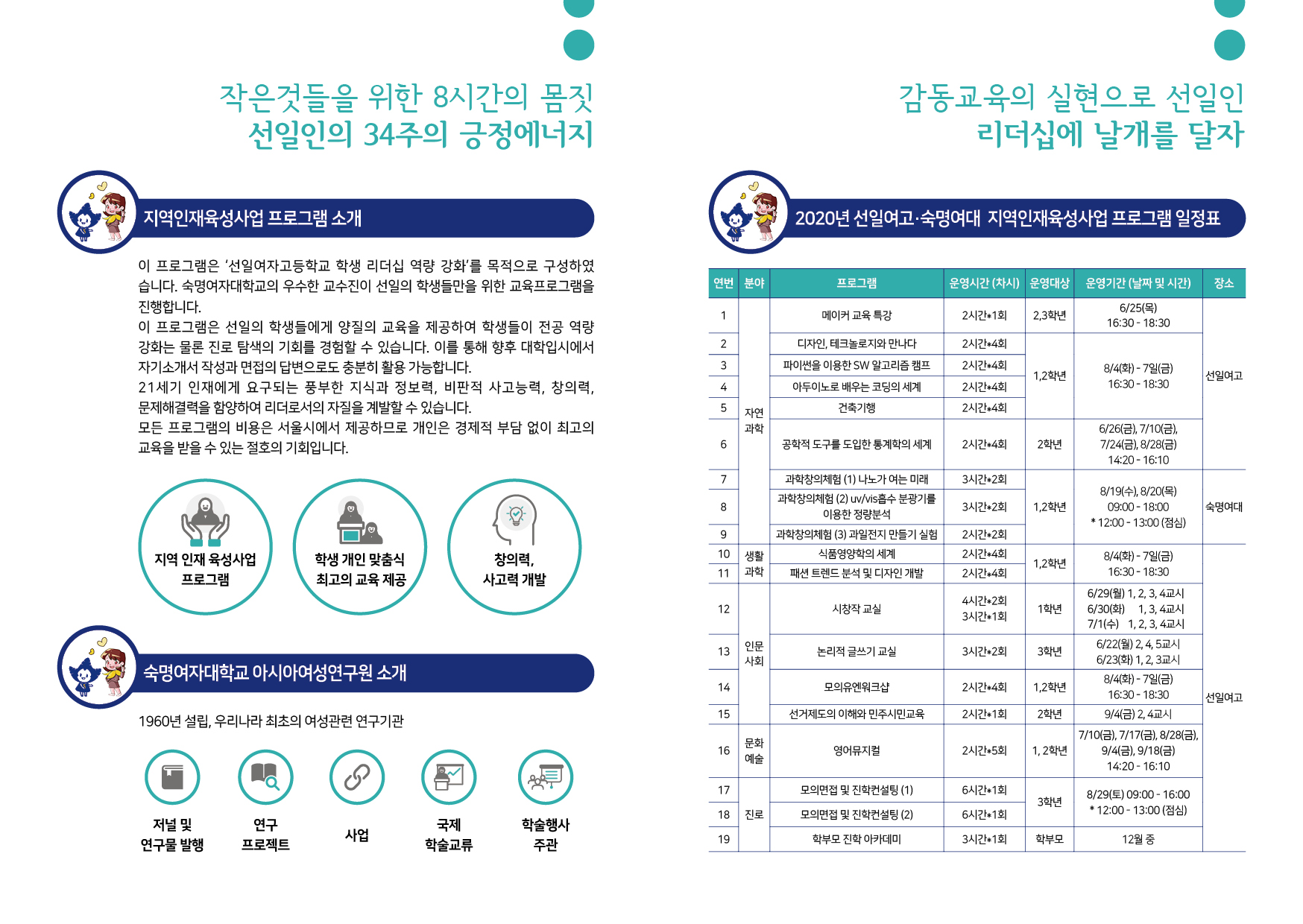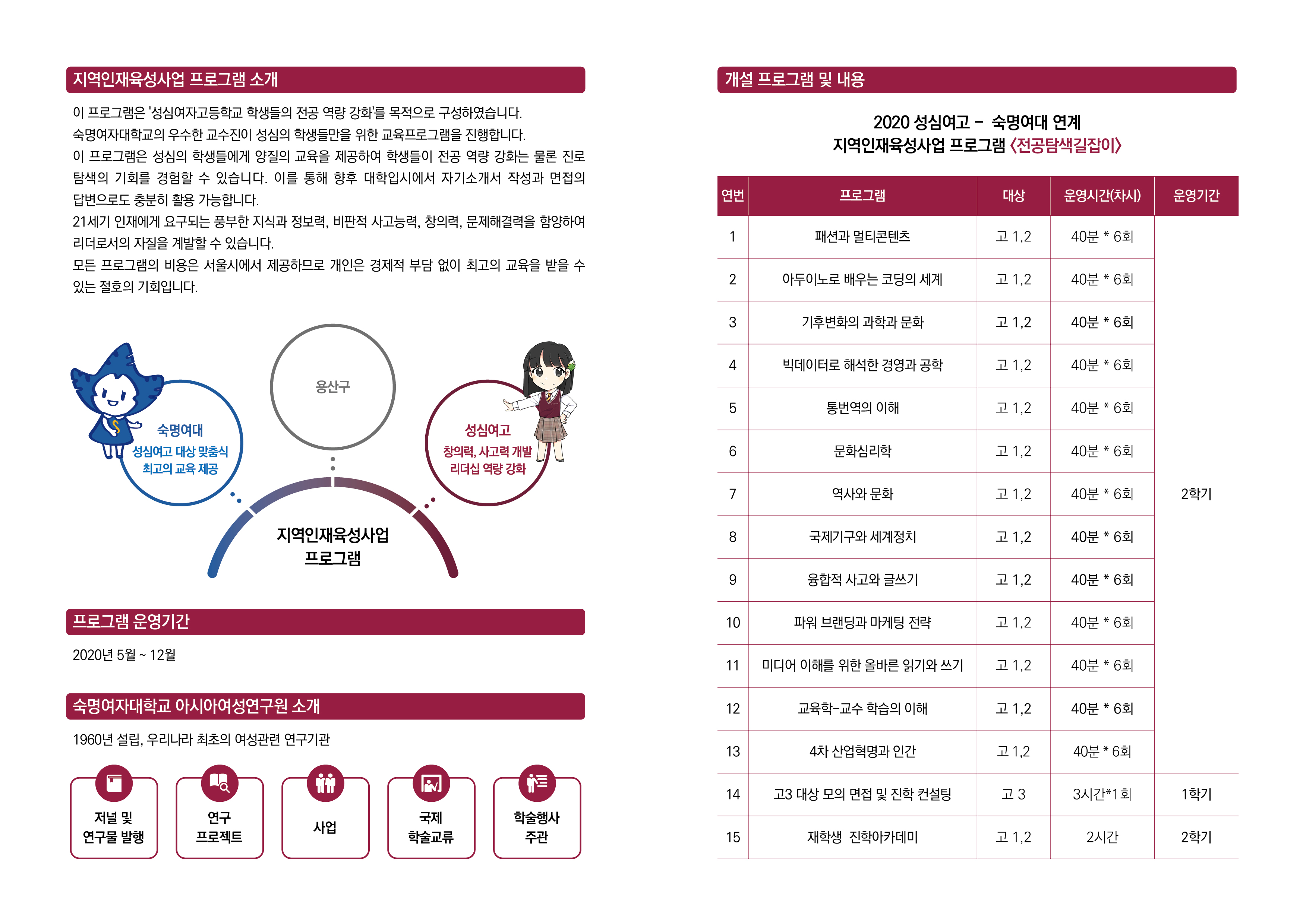 아시아여성연구원은 서울시의 후원으로 용산구, 은평구, 강서구 소재 고등학교 대상 고교-대학연계 지역인재육성사업을 다음과 같이 운영함.