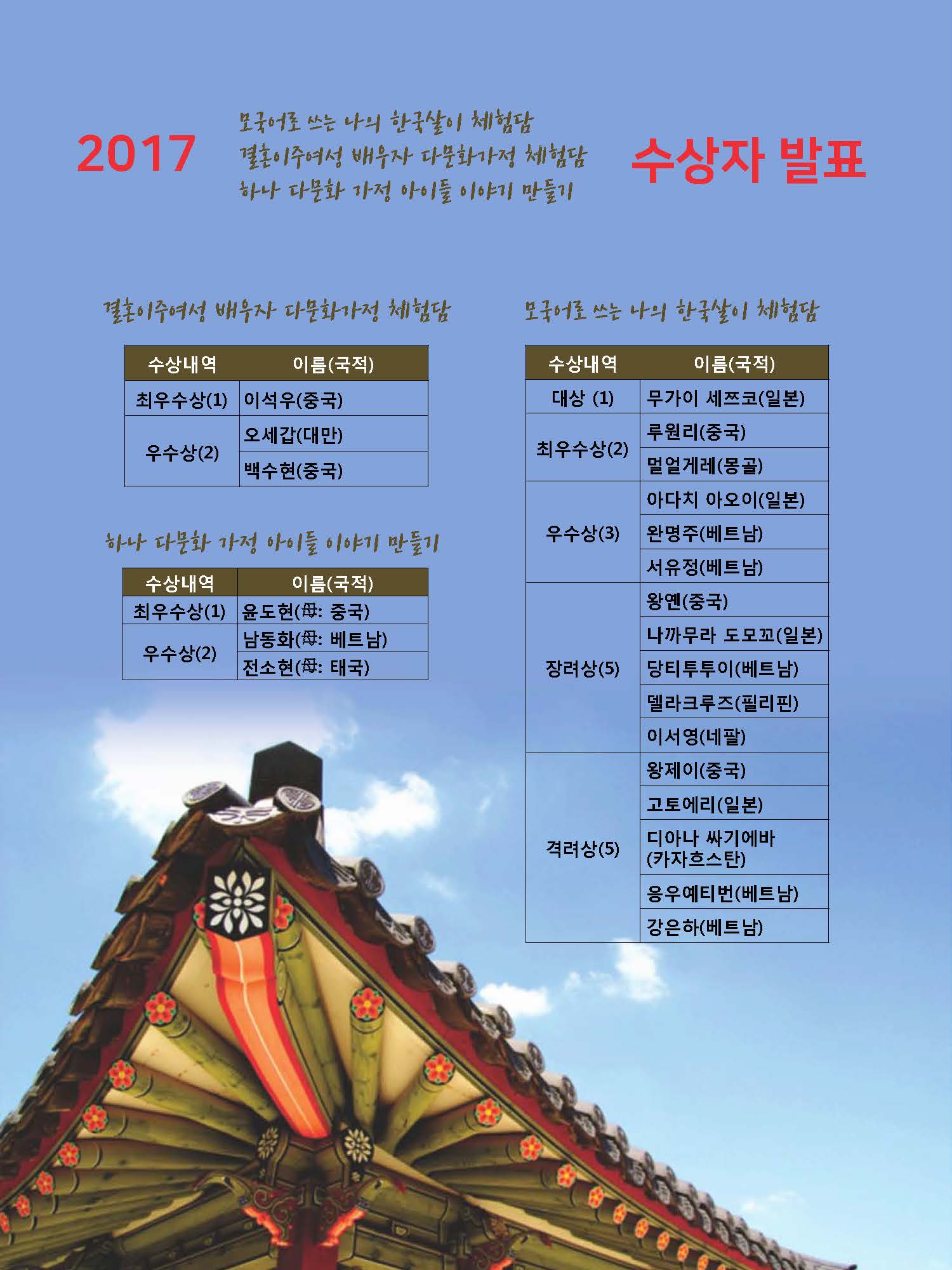 ‘2017년 모국어로 쓰는 나의 한국살이 체험담 현상공모전’, ‘2017년 결혼이주여성 배우자 다문화가족 체험담 현상공모전’, ‘2017하나 다문화 가정 아이들 이야기 만들기 현상공모전’에서 위와 같이 수상하셨습니다.