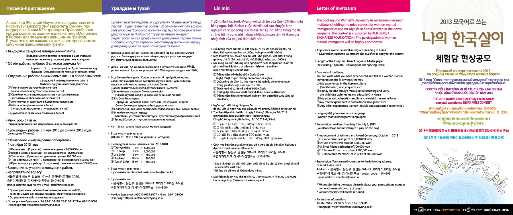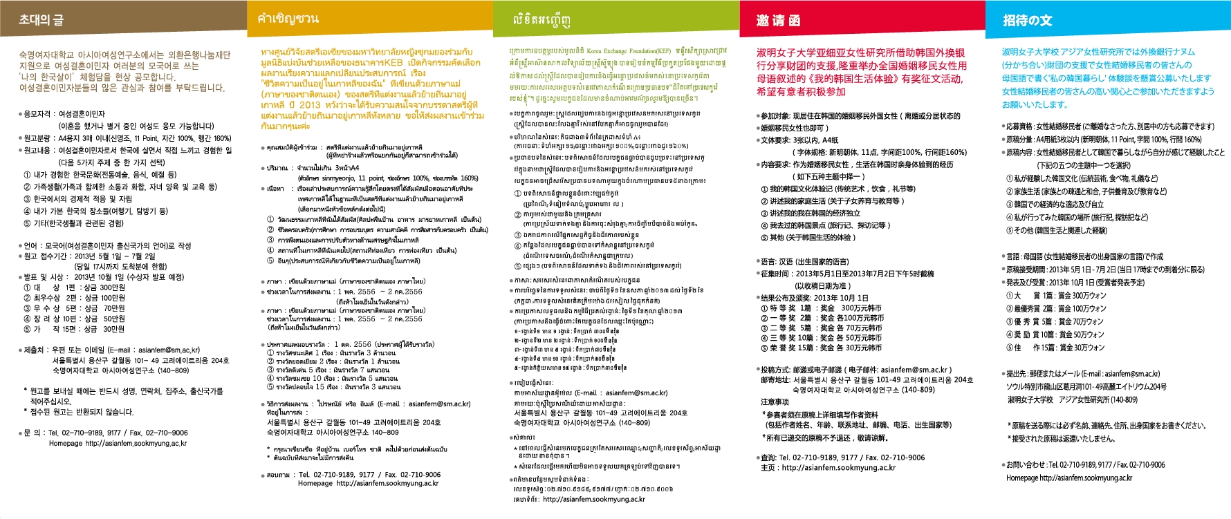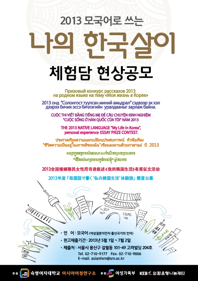 숙명여자대학교 아시아여성연구소에서는 외환은행나눔재단 지원으로 여성결혼이민자 여러분의 모국어로 쓰는 '나의 한국살이' 체험담을 현상 공모합니다. 여성결혼이민자분들의 많은 관심과 참여를 부탁드립니다.