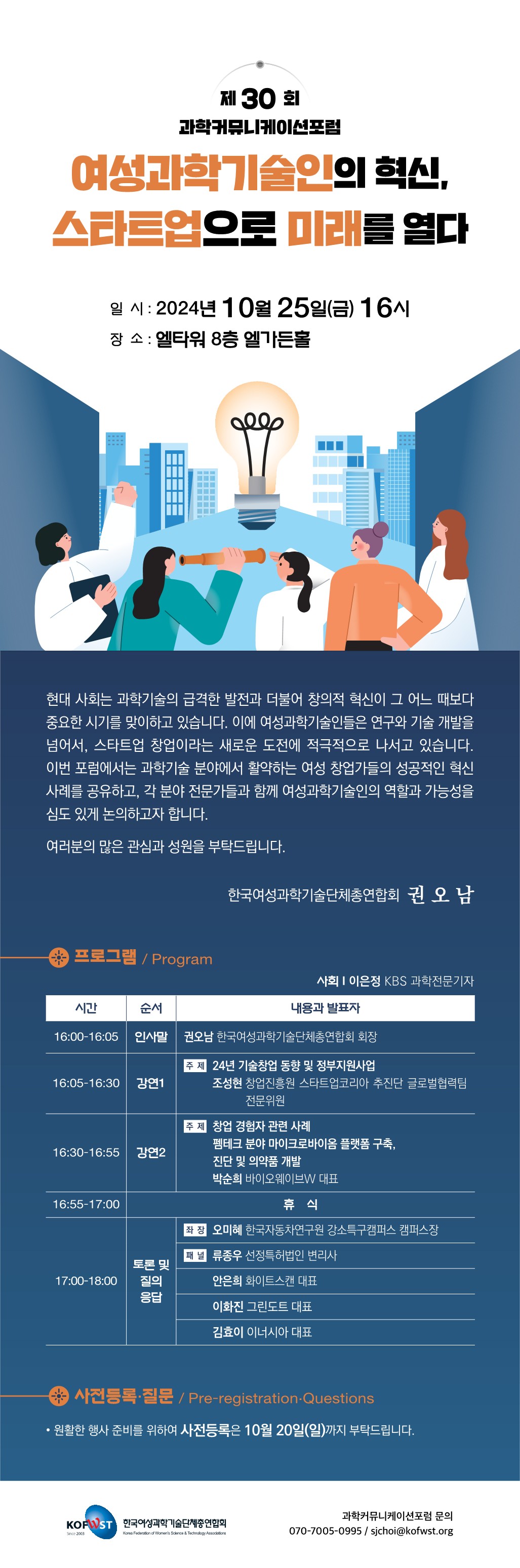[여성과총] 제30회 과커포럼 <여성과학기술인의 혁신, 스타트업으로 미래를 열다>