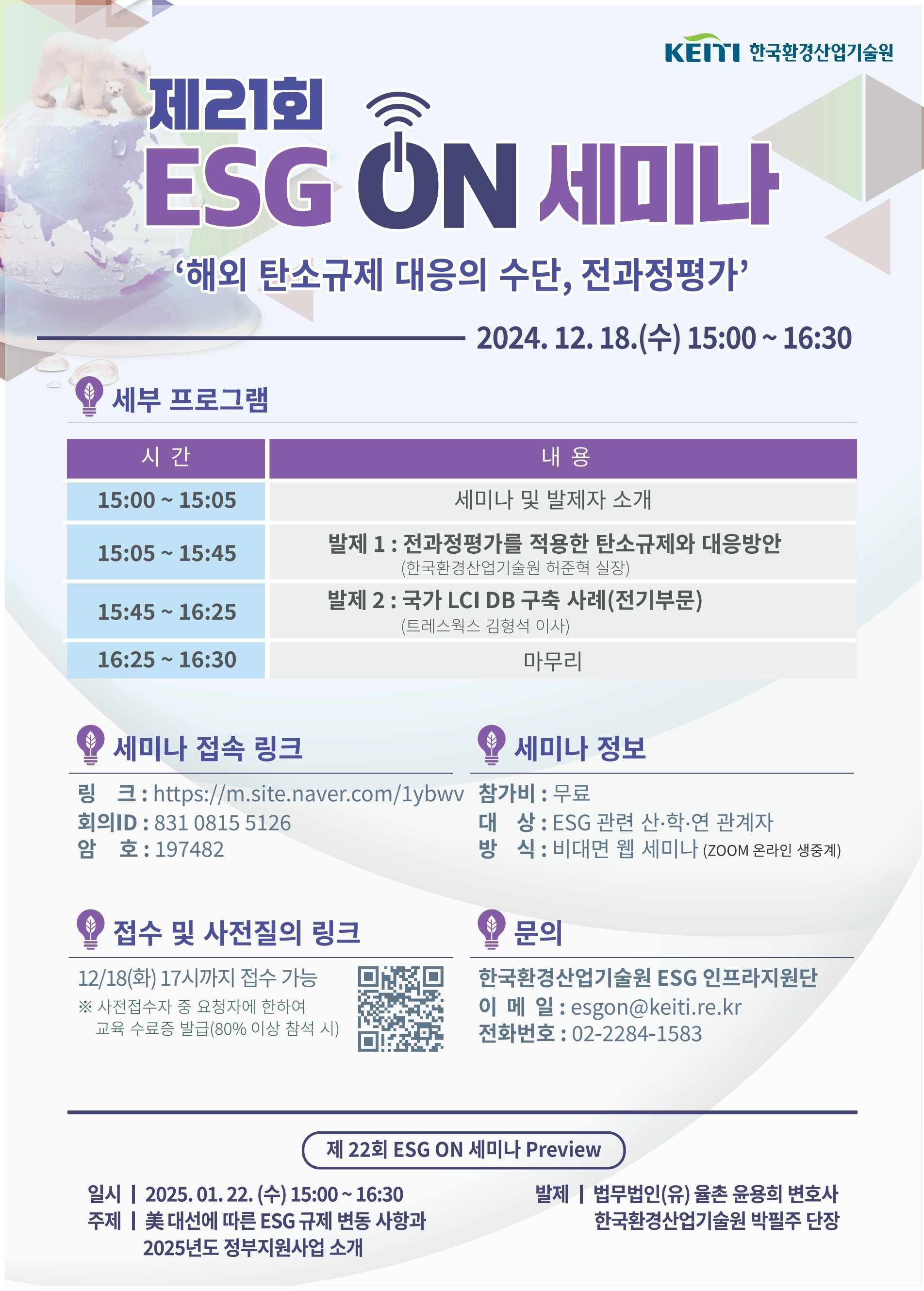 '24.12월은 '해외 탄소규제 대응의 수단, 전과정평가'를 주제로 <제21회 ESG ON 세미나>를 개최합니다.