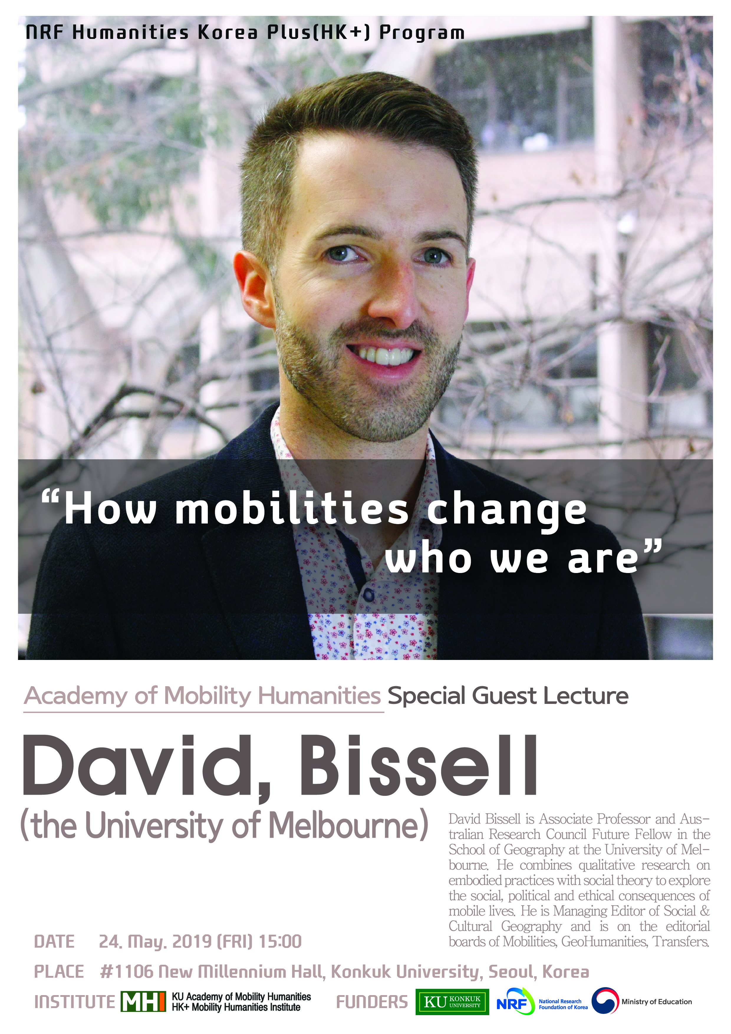 오는 5월 24일(금) 오후 3시부터 호주 멜버른 대학의 데이비드 비셀(David Bissell) 교수님을 모시고 해외저명학자초청강연을 개최합니다.