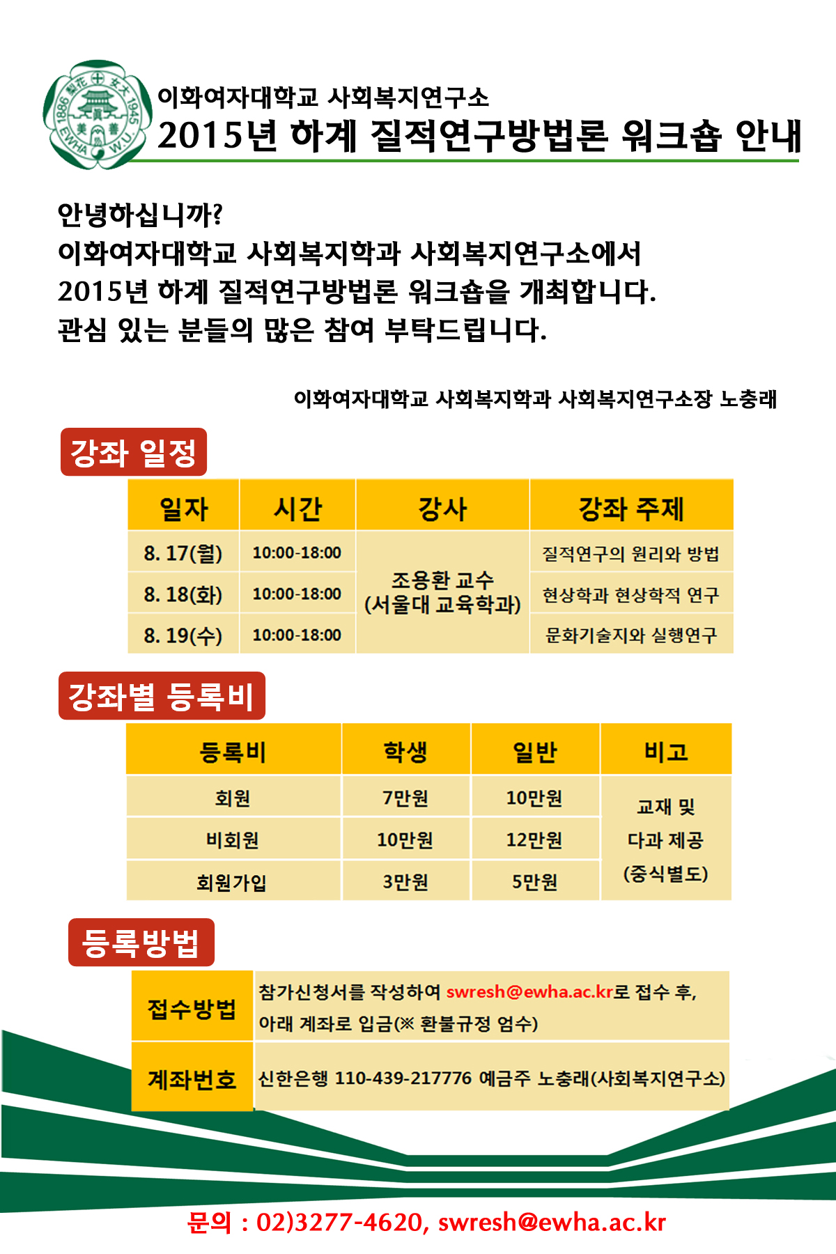 2) 첨부된 참가 신청서를 작성하여 swresh@ewha.ac.kr 로 접수 후 등록비 입금