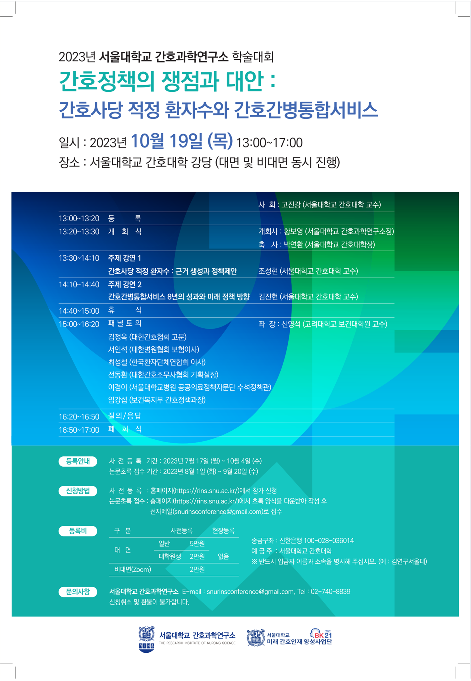 간호과학연구소 & BK21에서 주관하는 2023년 서울대학교 간호과학연구소 국내학술대회가 아래와 같이 진행될 예정으로 많은 관심과 참여 부탁드립니다.
