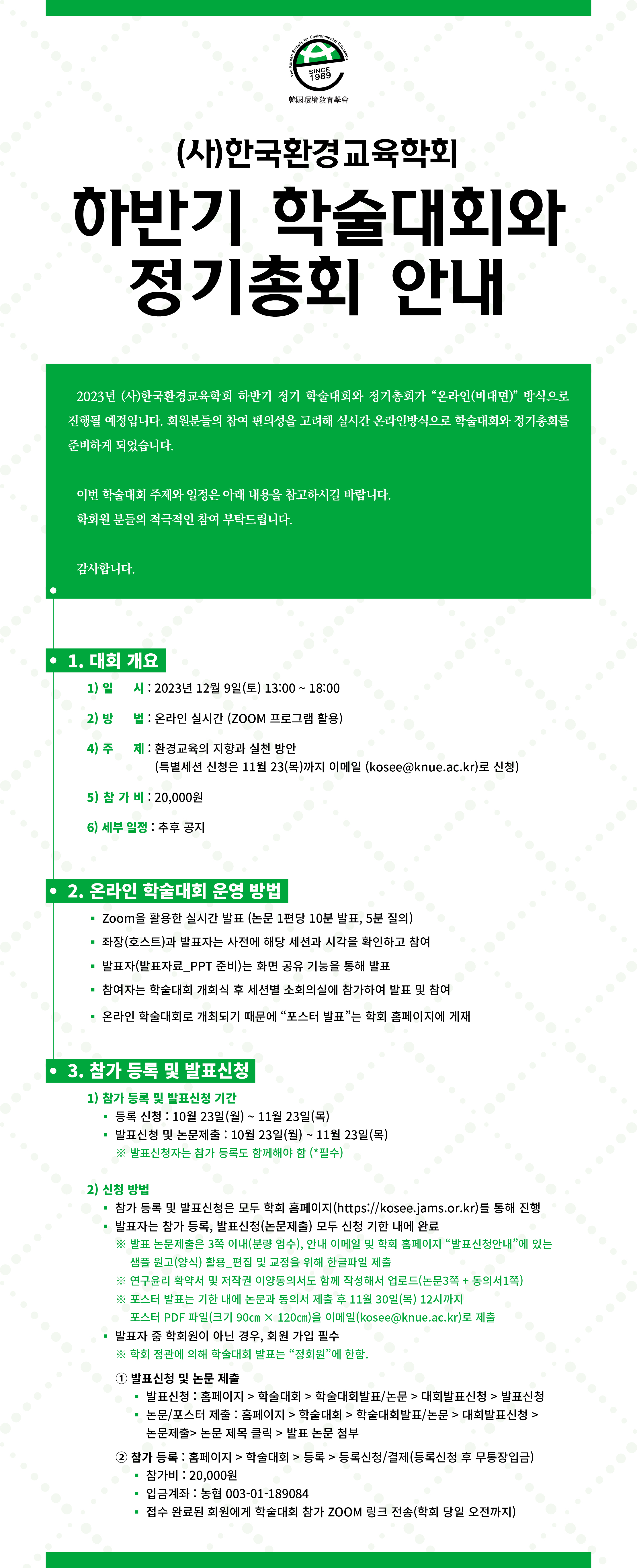 2023년 (사)한국환경교육학회 하반기 정기 학술대회와 정기총회가 “온라인(비대면)” 방식으로 진행될 예정입니다.