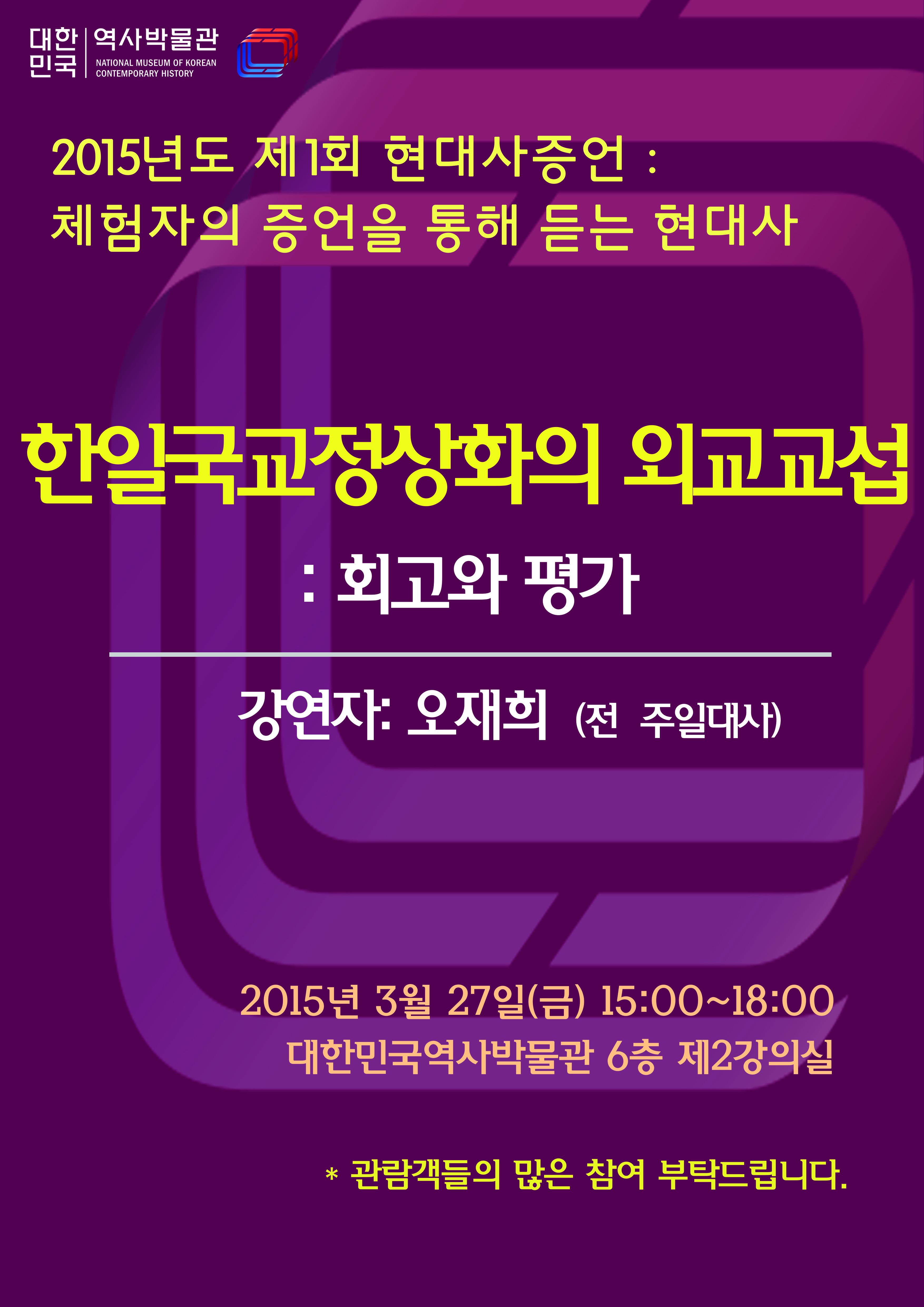 광복70년, 한일국교정상화 50주년을 맞아, 2015년도는 남북관계와 한일국교정상화를 주제로 현대사 증언을 개최하고자 합니다.