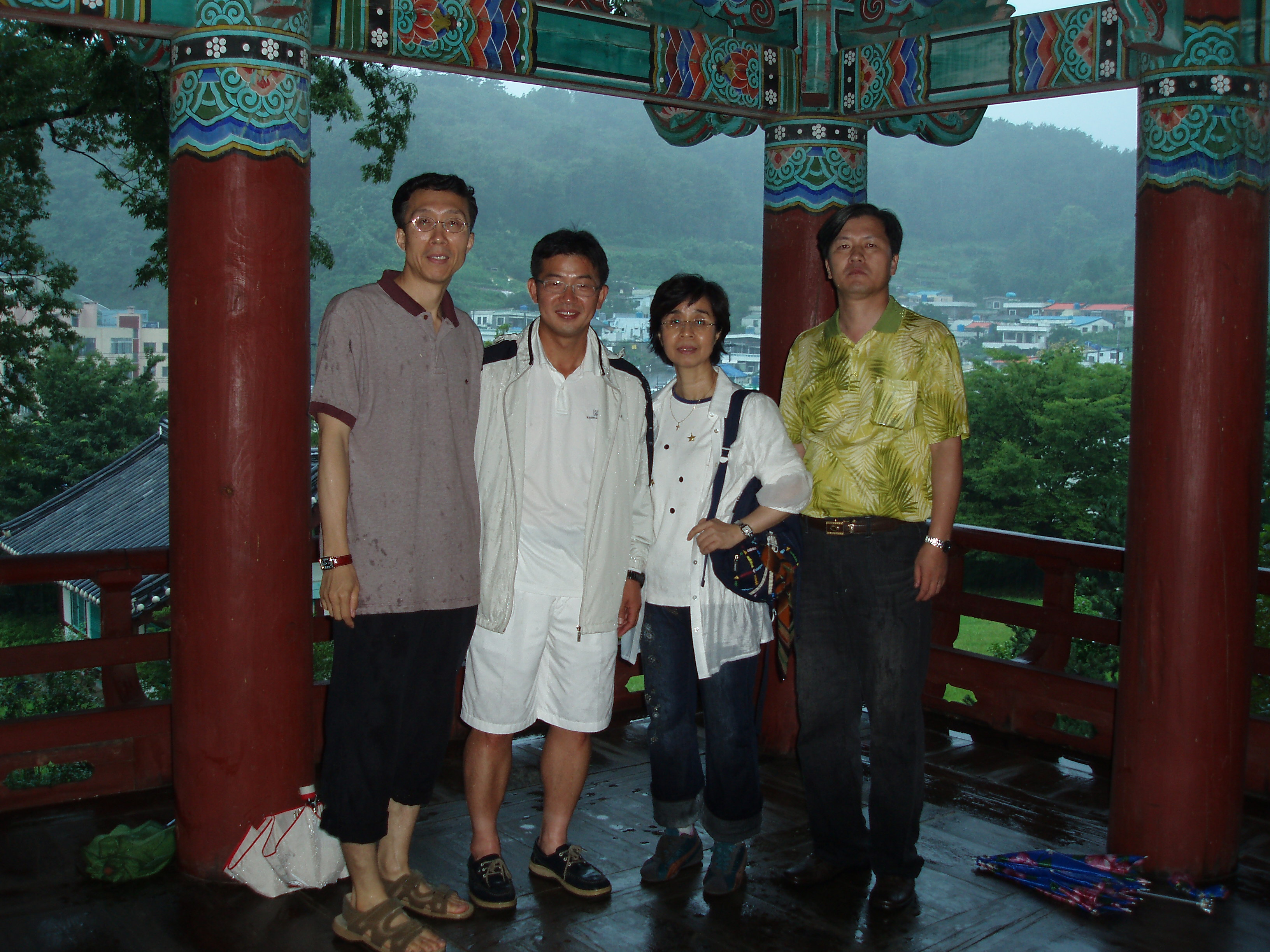 충렬사 전각에서 통영시를 뒤로 하고. 왼쪽부터 최치원, 김정호, 박의경, 이지경 쌤.