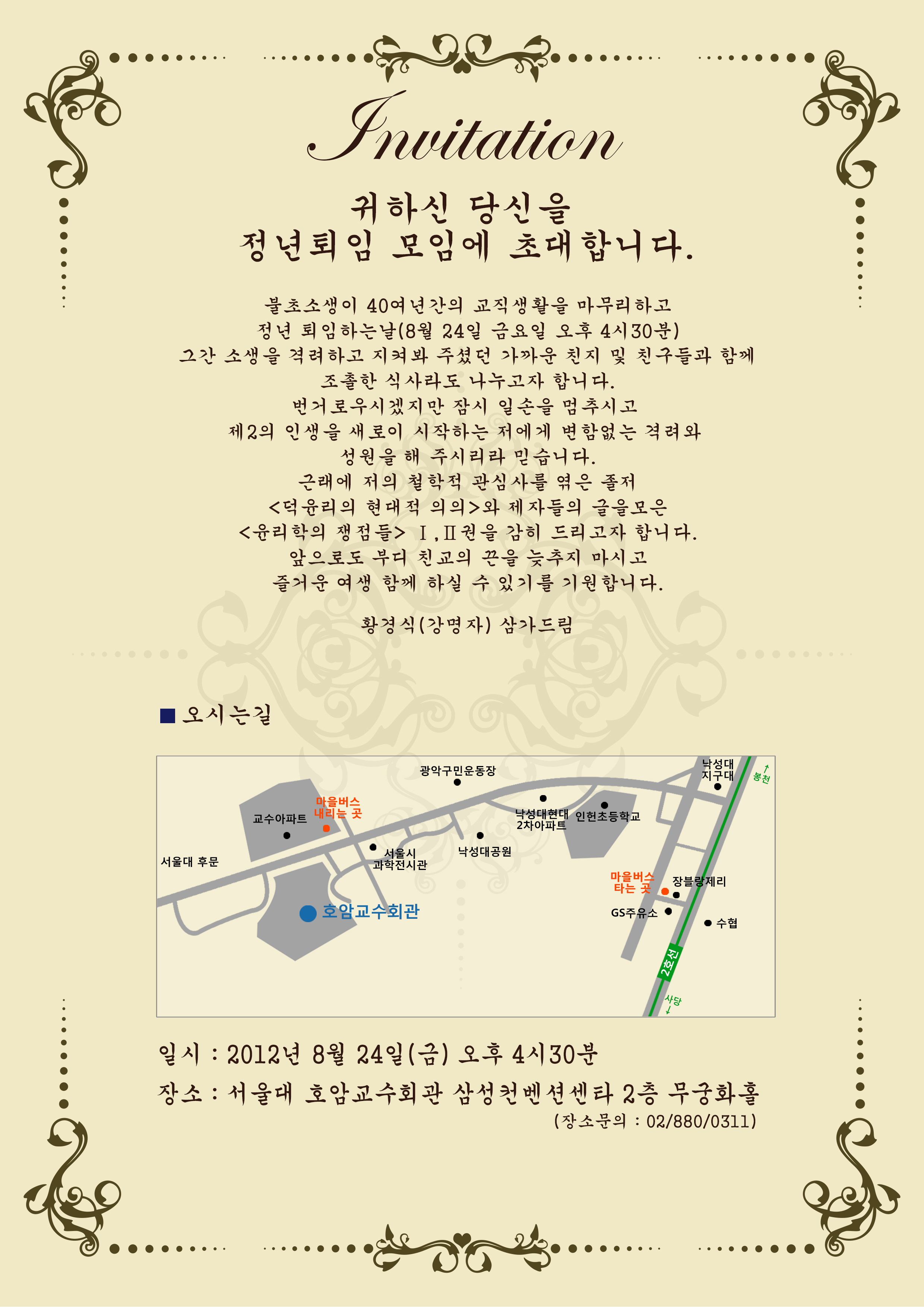 서울대학교 황경식 선생님의 정년 퇴임 모임을 공지해 드립니다.