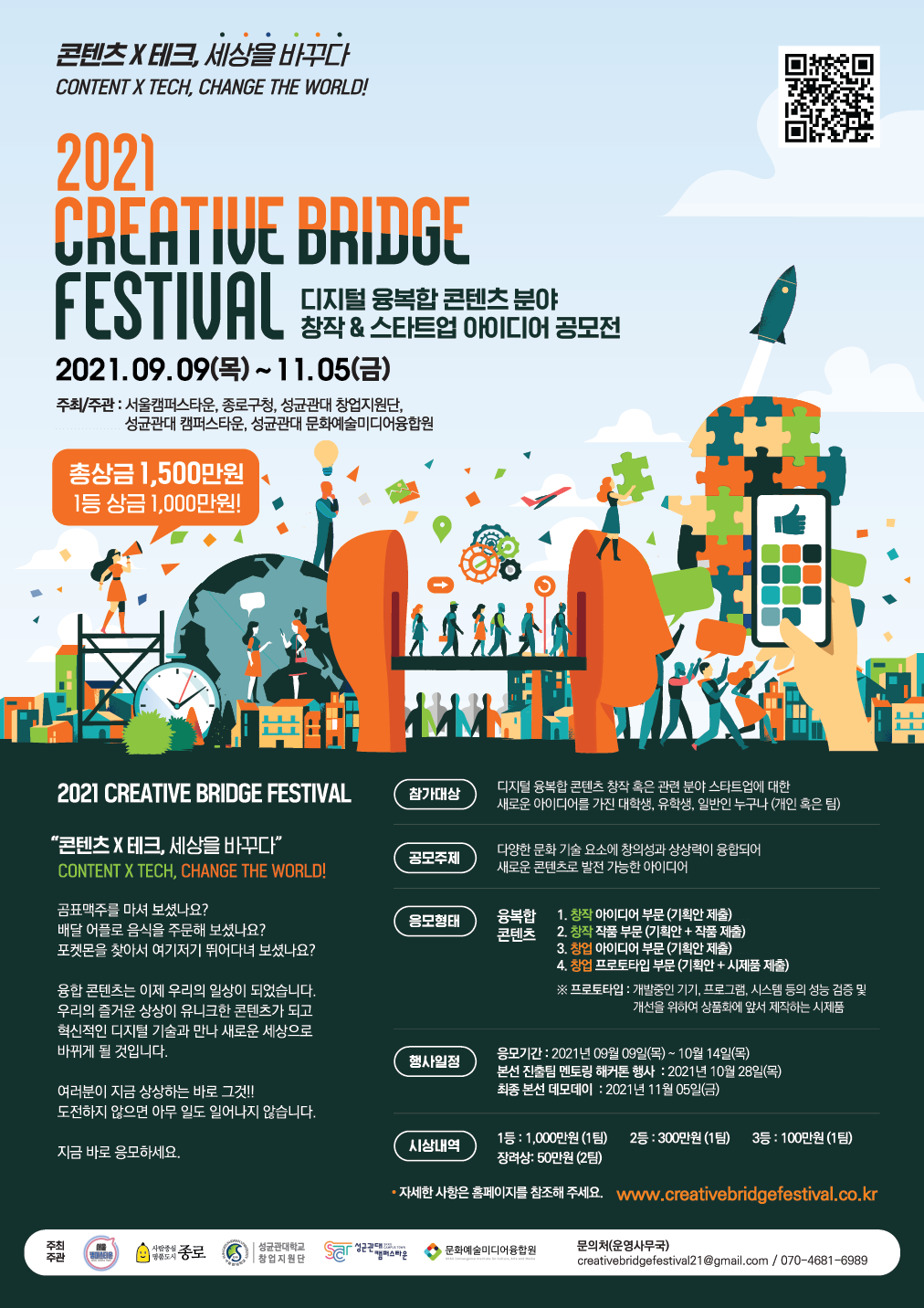 성균관대학교(총장 신동렬) 창업지원단 캠퍼스타운사업단(단장 김경환), 문화예술미디어융합원(원장 송승환)은 지난해에 이어 올해 “2021 Creative Bridge Festival”을 개최한다.