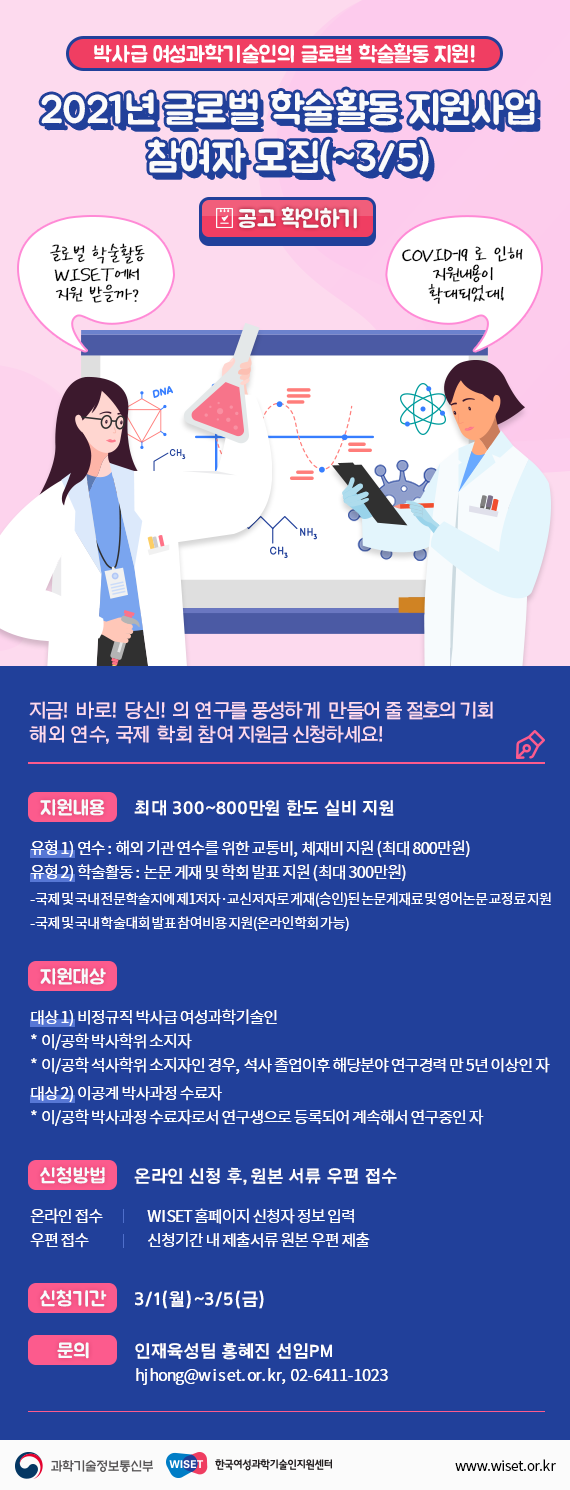 3) 지원내용 : 국외기관 연수 및 학술활동(논문게재, 학회 발표 지원) 비용 지원(최대 800만원)