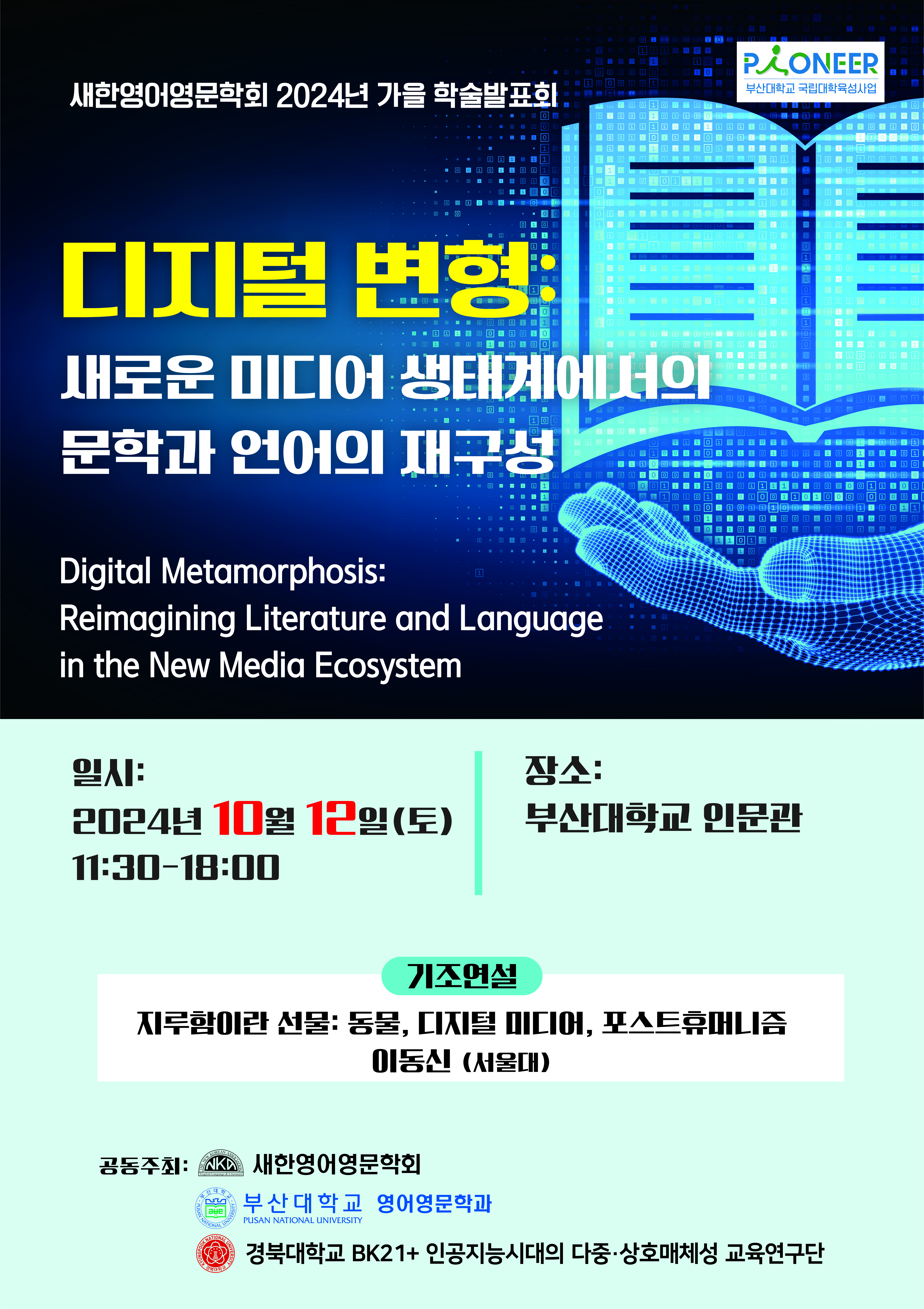 2024년 10월 12일 토요일 부산대학교에서 가을학술대회가 개최됩니다. 이번 가을 학술대회는 “디지털 변형: 새로운 미디어 생태계에서의 문학과 언어의 재구성”(Digital Metamorphosis: Reimagining Literature and Language in the New Media Ecosystem)이라는 주제로 문학과 언어, 뉴미디어 간의 복잡한 관계를 탐구하고자 합니다.