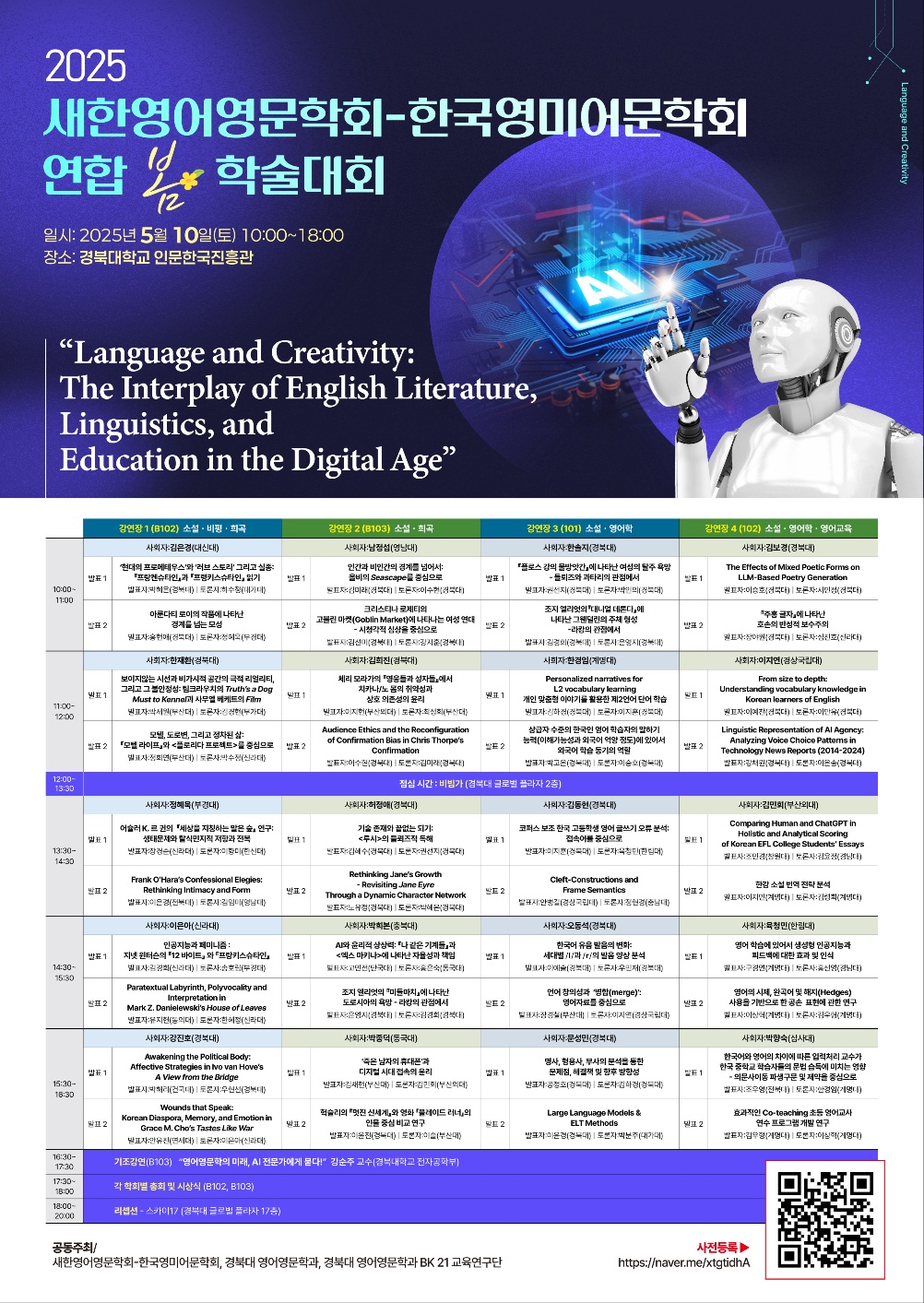 대구의 한국영미어문학회와 연합 학술대회로 개최 예정인 2025년 봄 학술대회 프로그램과 포스터를 공지 드립니다. 또한 이번 학술대회는 연합학술대회로 열리기에 등록방법과 등록비가 기존과 차이가 있어 아래와 같이 안내드립니다.