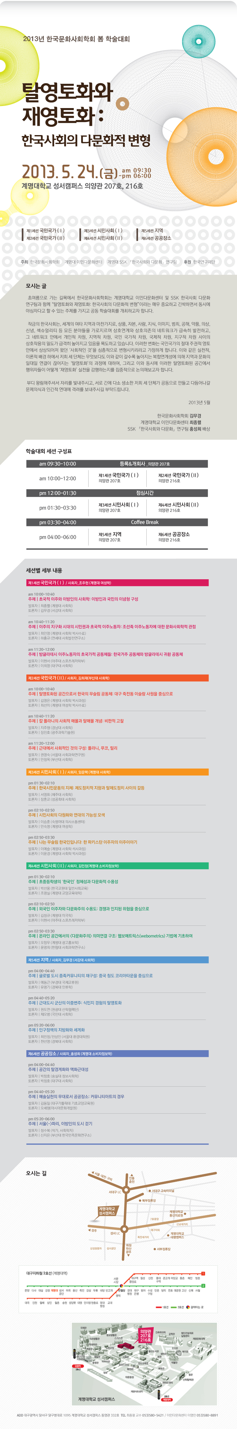 초여름으로 가는 길목에서 한국문화사회학회는 계명대학교 이민다문화센터 및 SSK 한국사회 다문화 연구팀과 함께 “탈영토와 재영토화: 한국사회의 다문화적 변형”이라는 매우 중요하고 긴박하면서 동시에 야심차다고 할 수 있는 주제를 가지고 공동 학술대회를 개최하고자 합니다.