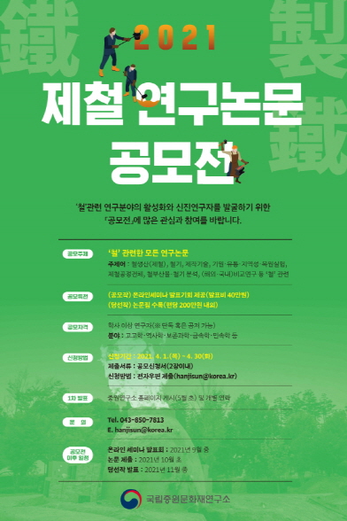 국립중원문화재연구소는 제철 관련 연구 분야의 신진 연구자 발굴 및 연구 활성화에 기여하고자 2021년도 「제철 연구논문」 을 모집하고자 하오니, 관심 있는 연구자분들의 많은 관심과 참여를 바랍니다.