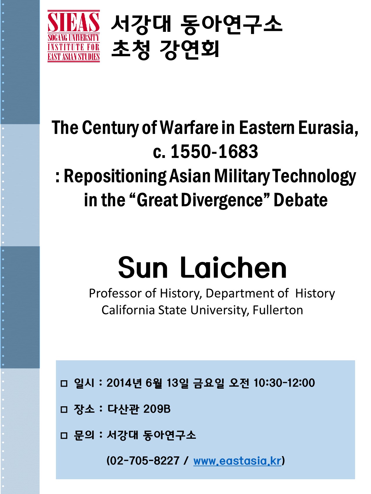 o 강연내용: This lecture is part of Sun Laichen’s ongoing book project, which examines warfare in Eastern Eurasia during the period of 1550-1683 (the “long seventeenth century”). It aims to reconstruct the history of Eastern Eurasia from a military historical approach by identifying a “century of warfare” based on frequency, scale, and social impact of war and military innovation, arguably the most warlike era in pre-modern times, and perhaps for all of recorded history. In the process, it intervenes in the “Great Divergence” debate by repositioning Asian military technology in the early modern period. Sun Laichen’s unprecedentedly comprehensive reconstruction of Eastern Eurasian warfare and military innovation allows a deeper assessment of the position of Asian military technology vis-?-vis European military technology. The result is a much more nuanced perspective, one which departs from the positions of the various sides in the Great Divergence debate: orthodox, revisionist, or even middle-grounder.