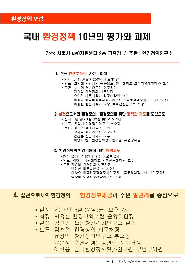 환경정의 시각으로 지난 10년 간의 국내 환경정책에 대해 평가하고 환경정의 실현을 위한 정책과제를 제안하기 위한 연속 포럼이 진행되고 있습니다.
