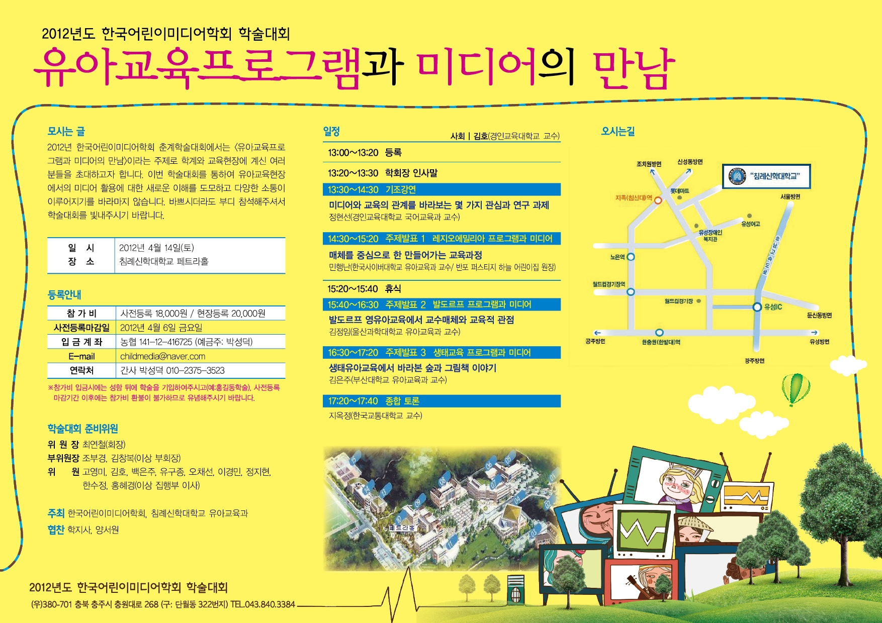 | <2012년 한국어린이미디어학회 학술대회안내> 안녕하십니까? 한국어린이미디어학회입니다. 4월 14일(토)에 개최되는 한국어린이미디어학회 2012년 학술대회를 안내드리고자 합니다. 한국어린이미디어학회에서는 '유아교육 프로그램과 미디어의 만남'이라는 주제로 학계와 교육현장에 계신 여러분을 초대하고자 합니다. 이번 학술대회를 통하여 유아교육현장에서의 미디어 활용에 대한 새로운 이해를 도모하고 다양한 소통이 이루어지기를 바라마지 않습니다. 바쁘시더라도 부디 참석해주셔서 학술대회를 빛내주시기 바랍니다. ---------------------------- 다 음 -------------------------------- * 장소 - 대전 침례신학대학교 페트라홀 * 일시 - 2012년 4월 14일 (토), 13:00 ~ 17:40 * 일정 기조 강연: 미디어와 교육의 관계를 바라보는 몇 가지 관심과 연구 과제 정현선(경인교육대학교 국어교육과 교수) 주제발표 1: 레지오에밀리아 프로그램과 미디어 매체를 중심으로 한 만들어가는 교육과정 민행난(한국사이버대학교 유아교육과 교수/ 반포 퍼스티지 하늘 어린이집 원장) 주제발표 2: 발도르프 프로그램과 미디어 발도르프 영유아교육에서 교수매체와 교육적 관점 김정임(울산과학대학교 유아교육과 교수) 주제발표 3: 생태교육 프로그램과 미디어 생태유아교육에서 바라본 숲과 그림책 이야기 종합 토론 지옥정(한국교통대학교 교수) * 등록안내 - 사전등록 : 18,000원 / 현장등록 20,000원 사전등록 마감일 : 2012년 4월 6일 금요일 임금계좌 : 농협 141-12-416725(예금주: 박성덕) * 학술대회 내용 및 사전등록과 관련된 자세한 내용은 첨부되는 리플렛을 참조하시기 바랍니다. |