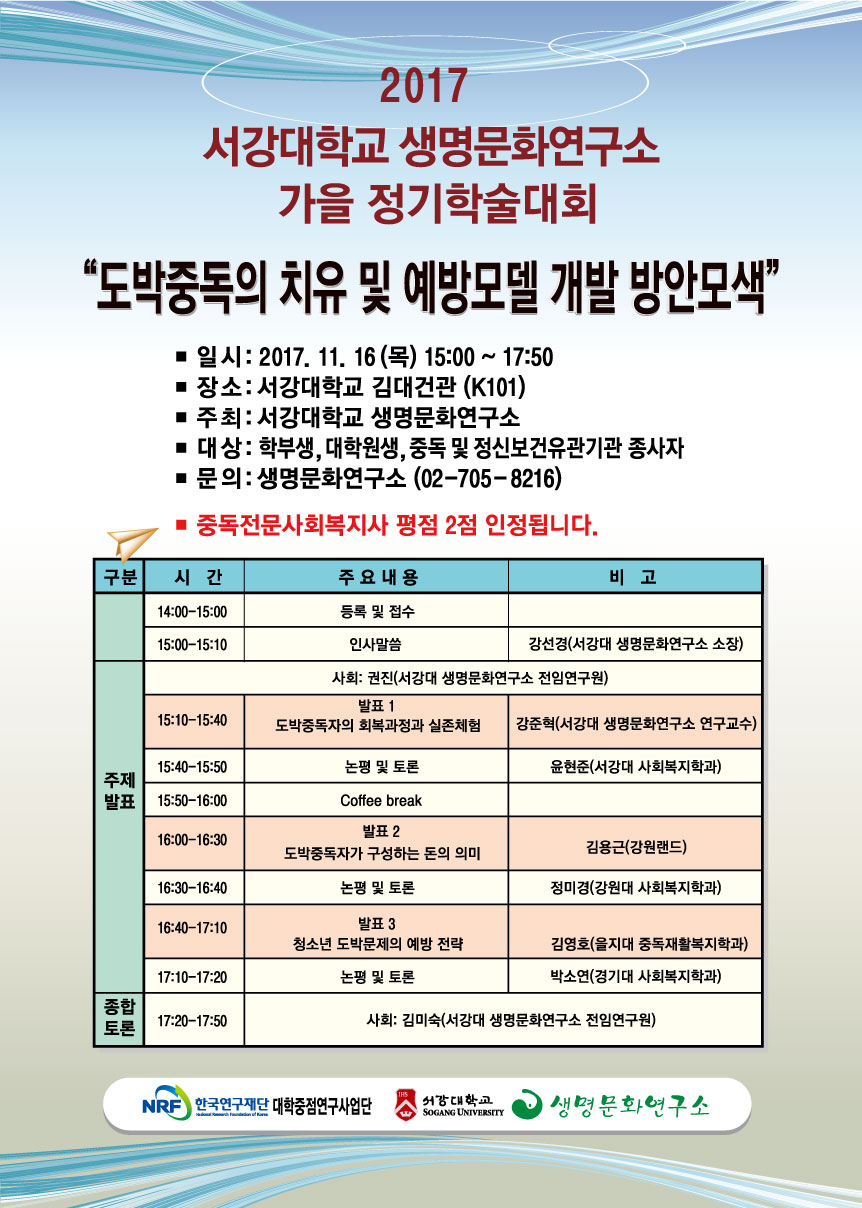 안녕하십니까? 서강대학교 생명문화연구소가 지난 9월 11일, 4대 중독(알코올, 마약, 도박, 인터넷)의 한국형 치유모델 및 프로그램 개발과 관련한 연구로 한국연구재단으로부터 ‘2017년 인문사회분야 대학 중점연구소’로 최종 선정되었습니다. 따라서 우리 생명문화연구소에 대해 안팎의 여러 곳에서 국내 중독 전문가 및 학자 네트워크의 허브로 도약할 것으로 기대하고 있습니다. 이러한 기대에 부응하기 위해 우리 연구소는 이번 학술대회부터 가능한 한 4대 중독 문제에 집중해서 계획, 개최하기로 하였습니다. 특히 이번에는 우선 4대 중독 문제 중에서도 ‘도박문제’를 시작으로 관련분야 최고 전문가 선생님들을 모시고 학문적 발전과 실천적 대안을 마련하기 위한 자리를 마련하였으니 많은 참여 부탁드립니다.