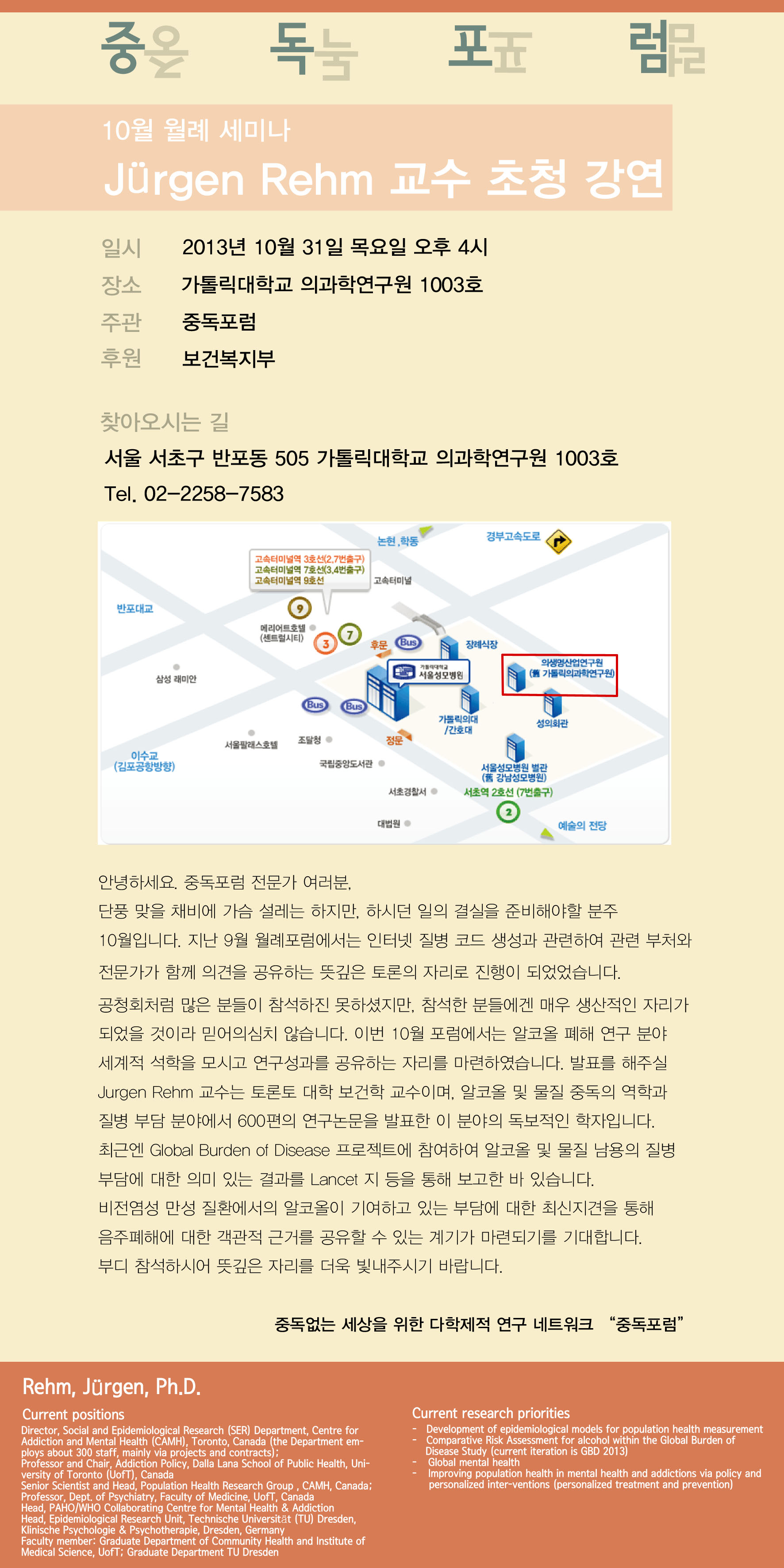 [10/31(목) 16:00, 중독포럼 10월 월례세미나] Jurgen Rehm 교수 초청 강연