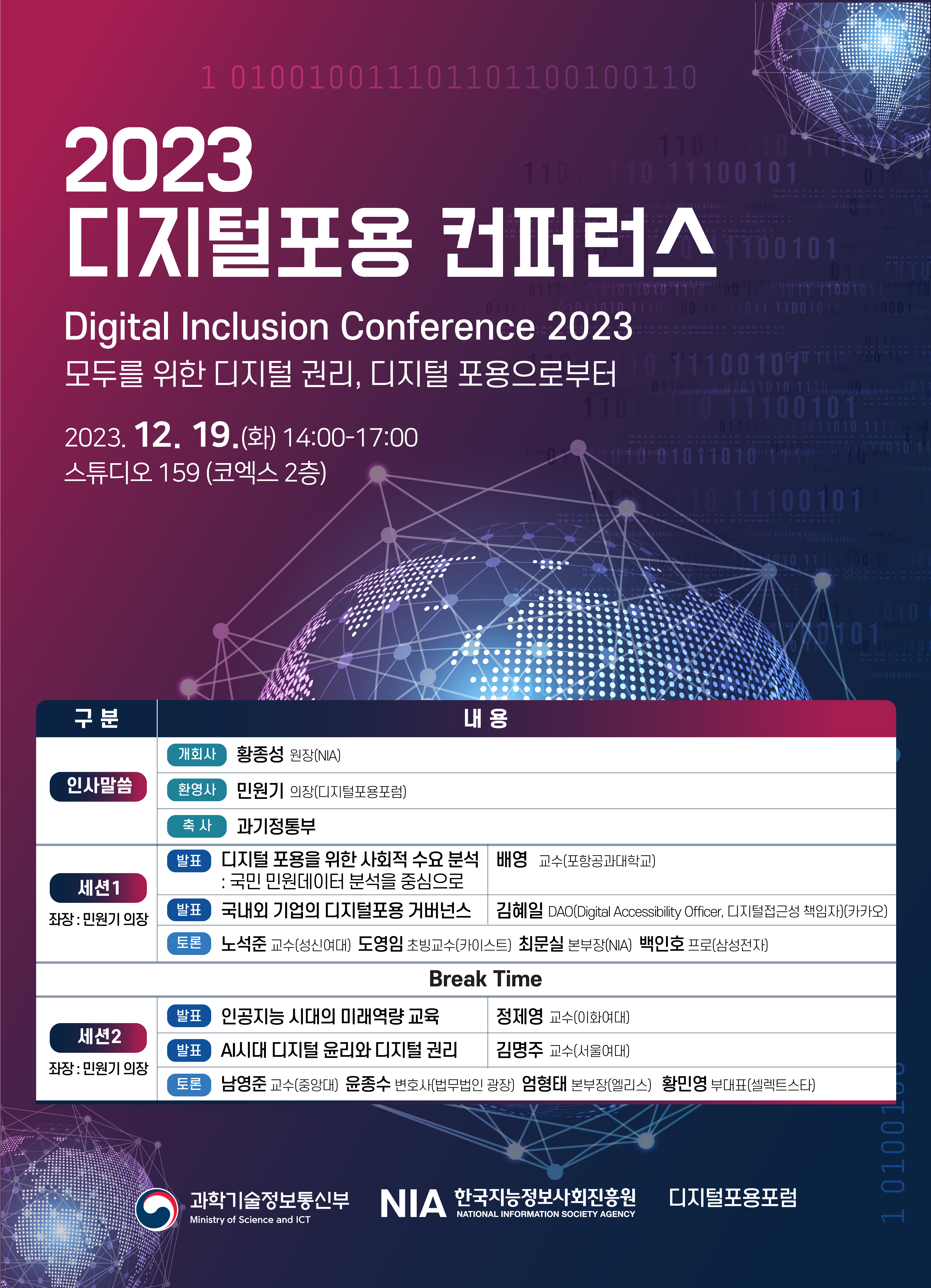 < 2023 디지털포용컨퍼런스 참석 안내 > o (일시) 2023년 12월 19일(화) 14:00~17:00, 코엑스(스튜디오159) o (주최) 과학기술정보통신부 o (주관) 한국지능정보사회진흥원‧디지털포용포럼 o (주제) “모두를 위한 디지털 권리, 디지털 포용으로부터” o (참석자) 민‧관‧학계 전문가 및 포럼위원, 일반 국민 등 o (사전신청) 온·오프믹스 링크(https://onoffmix.com/event/290731)에서 신청 * 현장 방문도 가능하나 참여인원 파악을 위해 사전 신청 부탁드립니다. |