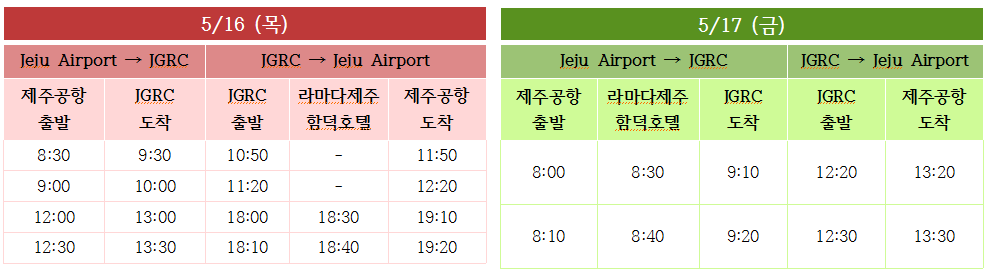 ▶ 5.17(금) 제주공항 8시출발 차량은 취소되었으므로, 8:10 차량 이용하시기 바랍니다.