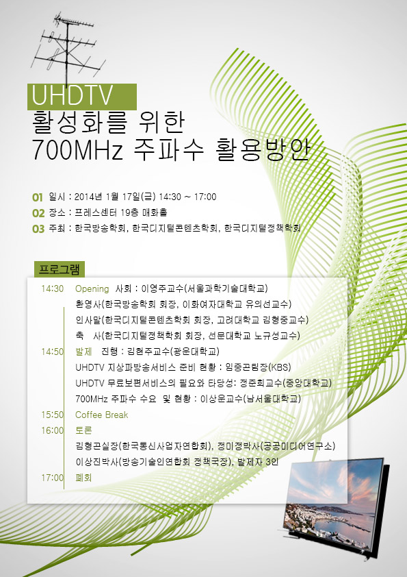 안녕하십니까? 한국디지털콘텐츠학회입니다. UHDTV 활성화를 위한 700MHz 주파수 활용방안에 대한 세미나를 개최합니다. 많은 분들의 관심과 참여 바랍니다.