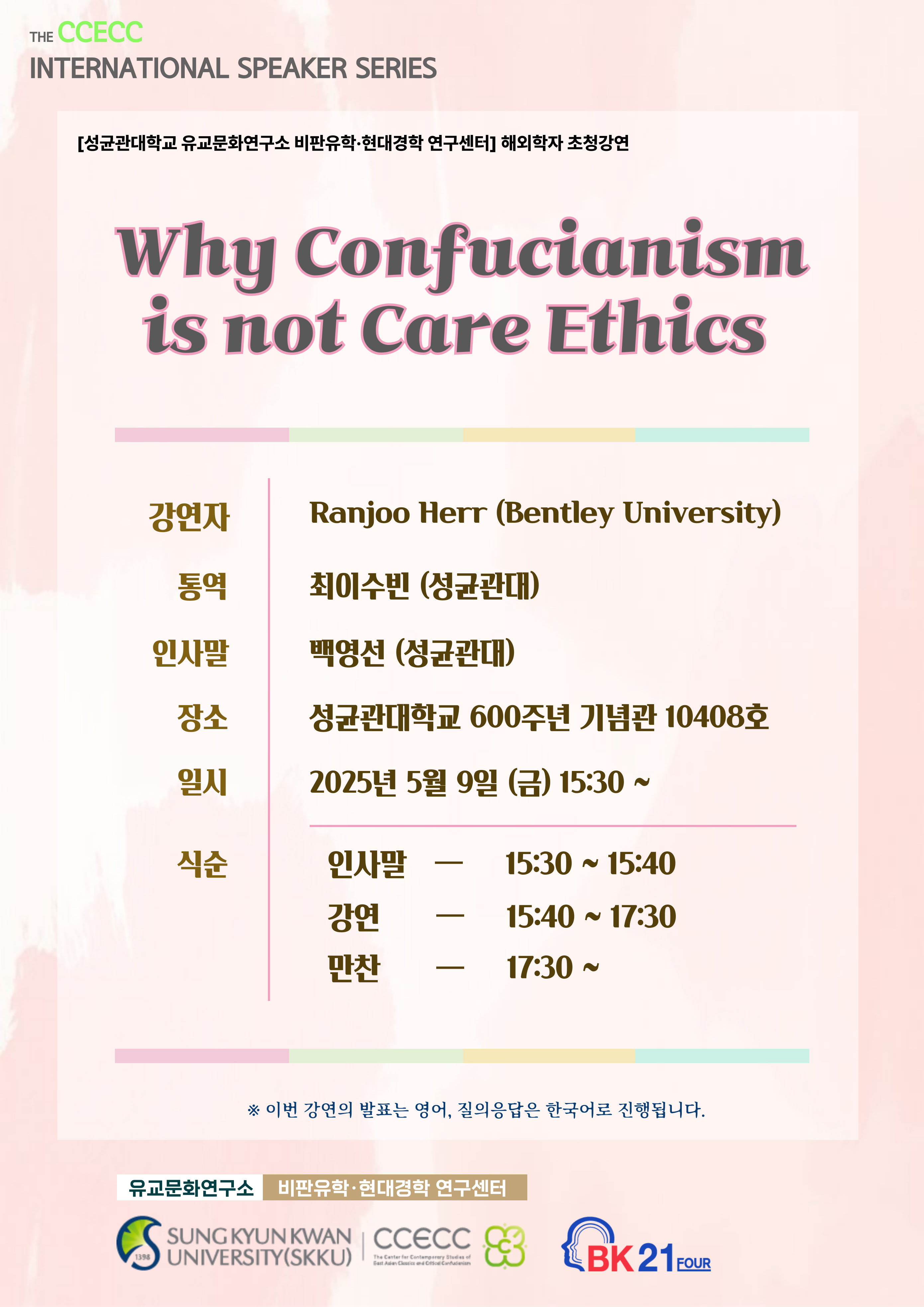 주제: 왜 유교는 돌봄윤리가 아닌가 Why Confucianism is Not Care Ethics 일시: 2025. 05. 09. 금 3:30-5:30pm 장소: 성균관대학교 600 주년기념관 10408 호 연사 : Ranjoo Herr (Department of Philosophy, Bentley University) |