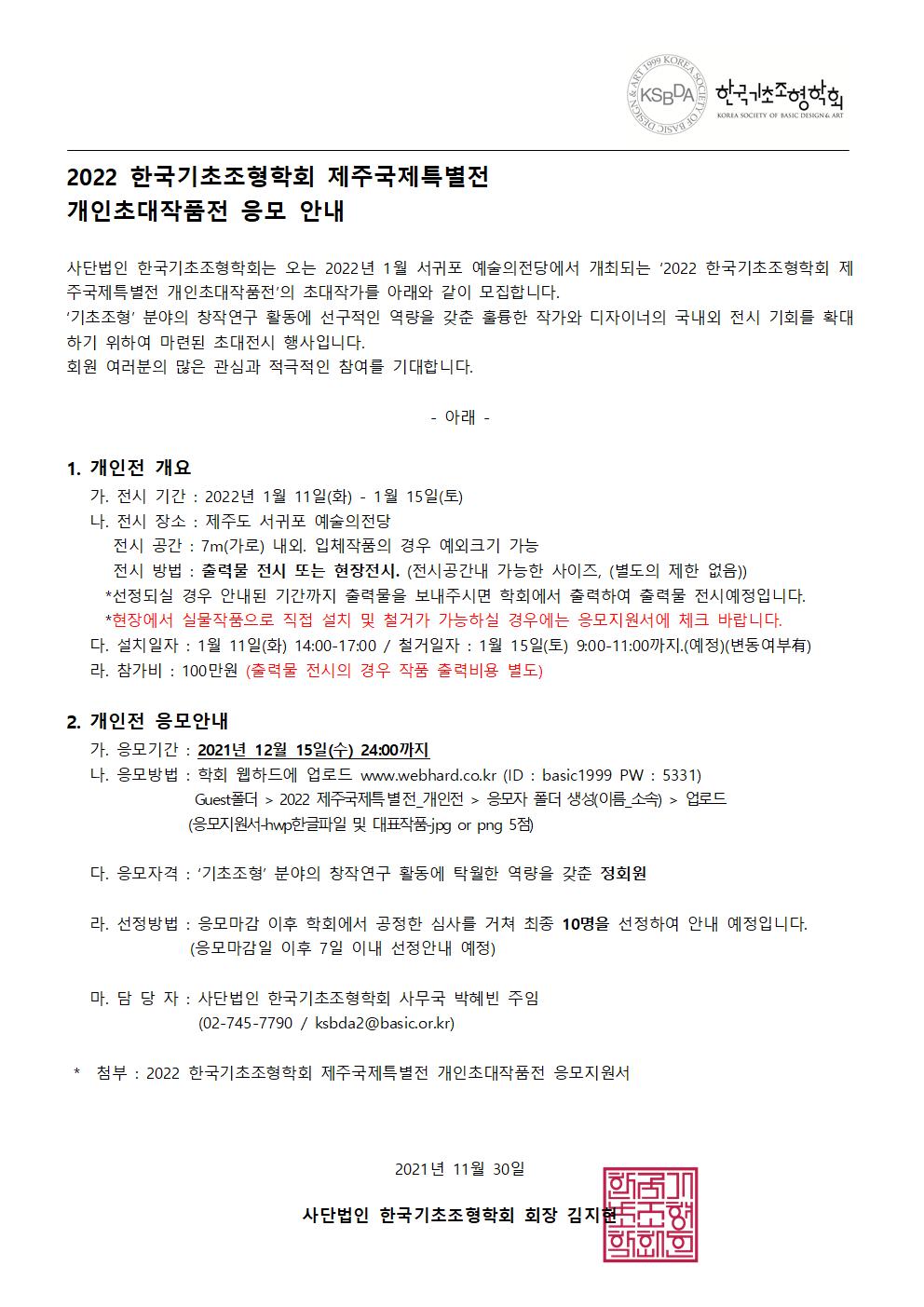 2022 한국기초조형학회 제주국제특별전 개인초대작품전 응모안내