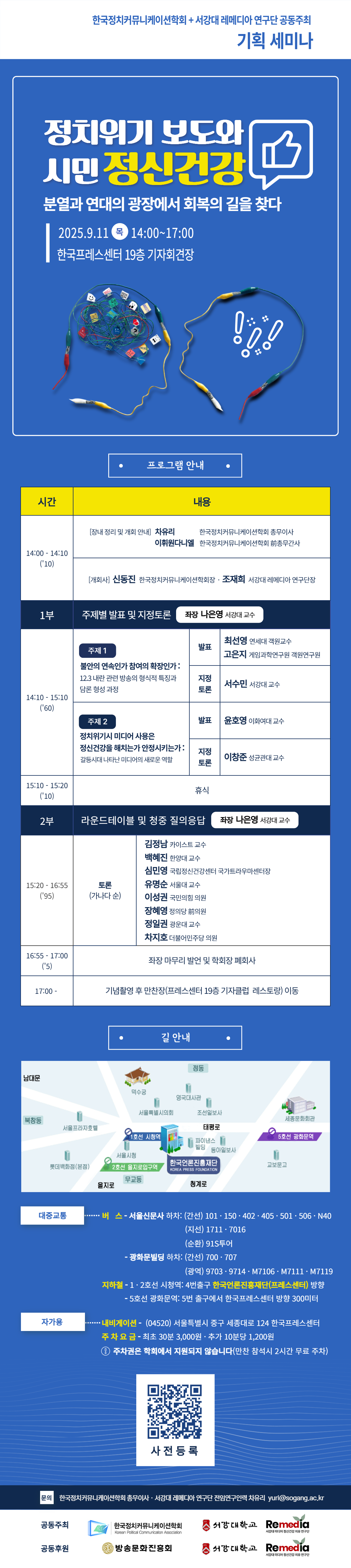 □ 세미나 주제: 정치위기 보도와 시민 정신건강: 분열과 연대의 광장에서 회복의 길을 찾다