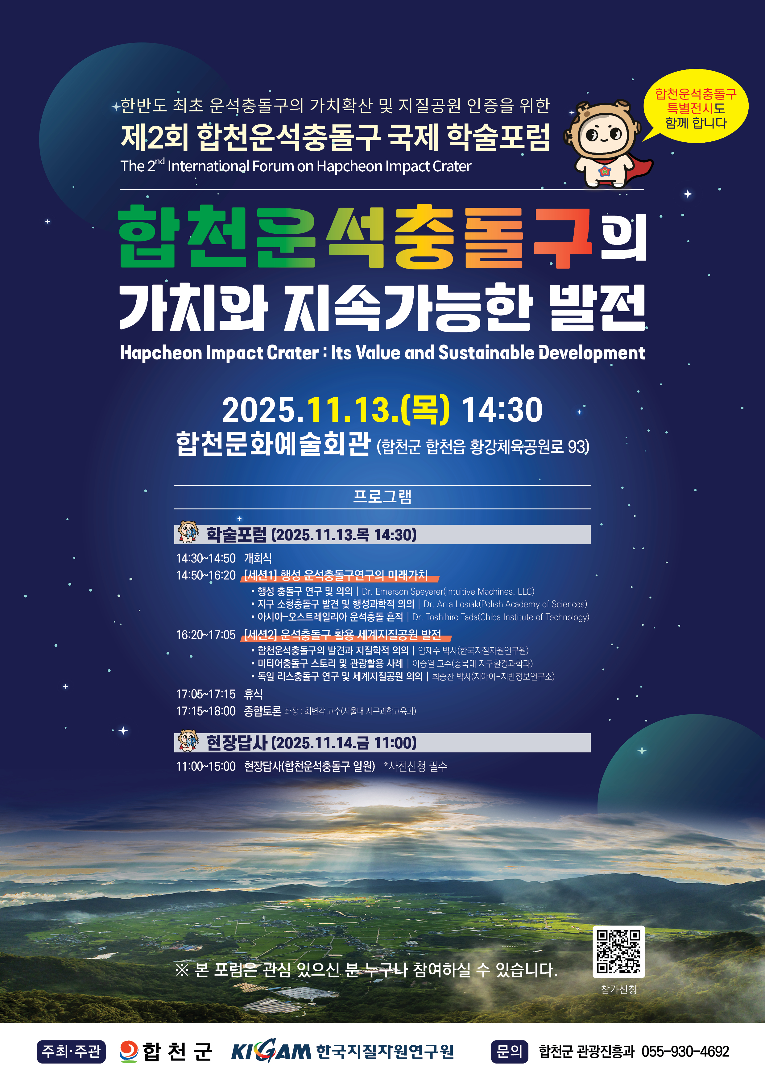 합천 운석충돌구의 교육, 과학, 관광자원 가치를 재조명하고 지질공원으로의 발전 방안을 모색하기 위한 '제2회 합천운석충돌구 국제 학술 포럼'을 다음과 같이 개최합니다.