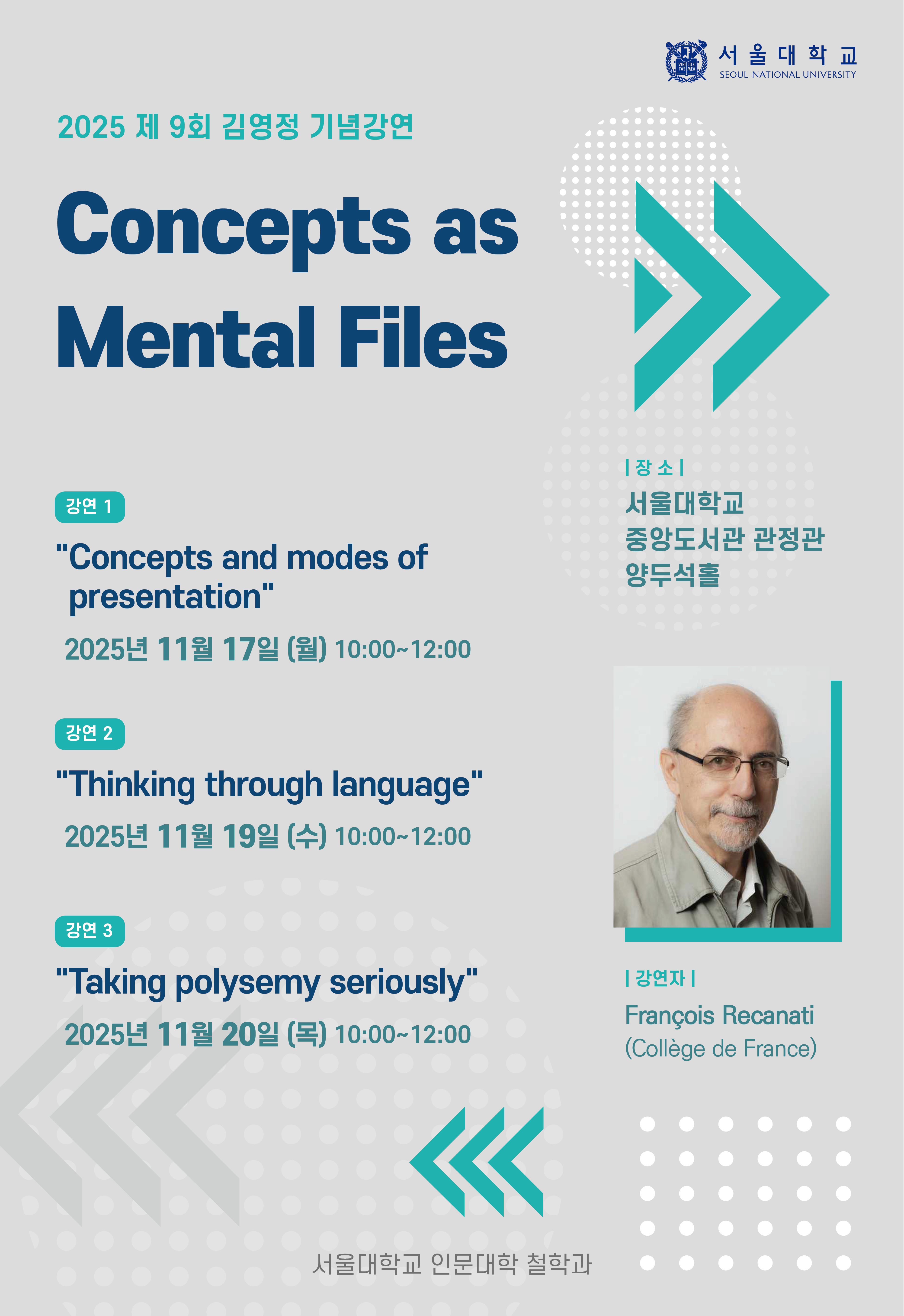 오는 11월에 개최될 이번 제9회 기념강연에서는 프랑스 콜레주 드 프랑스(Collège de France)의 프랑수아 르카나티(François Recanati) 교수를 초청하여 “Concepts as Mental Files”라는 제목으로 세 차례의 강연을 진행합니다. 르카나티 교수는 언어철학의 다양한 주제들에 대한 논문과 저서를 발표하여 분석 철학계에 큰 영향을 끼쳐 왔습니다. 특히 그는 맥락주의(Contextualism)라는 영향력 있는 입장을 제안함으로써 의미론(semantics)과 화용론(pragmatics) 사이의 역동적인 관계를 조명한 바 있습니다. 최근 르카나티 교수는 개별 대상을 표상하는 사고의 요소이자 개념으로 작동하는 심적 파일(mental files)에 관한 이론을 제안하여 연구의 영역을 언어철학과 심리철학의 교차지점으로 확장하였고, 현재까지 심적 파일의 이론을 둘러싼 다양한 국제적 연구와 논의들이 진행되고 있습니다. 이번 강연에서 르카나티 교수는 언어적 의미와 사고의 영역에서 심적 파일이 어떤 식으로 작동하는지 설명하고, 언어와 사고의 관계에 대한 철학적 함의를 논의할 것으로 기대됩니다.